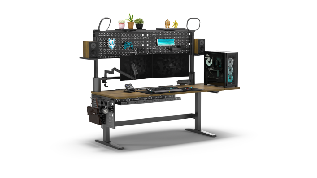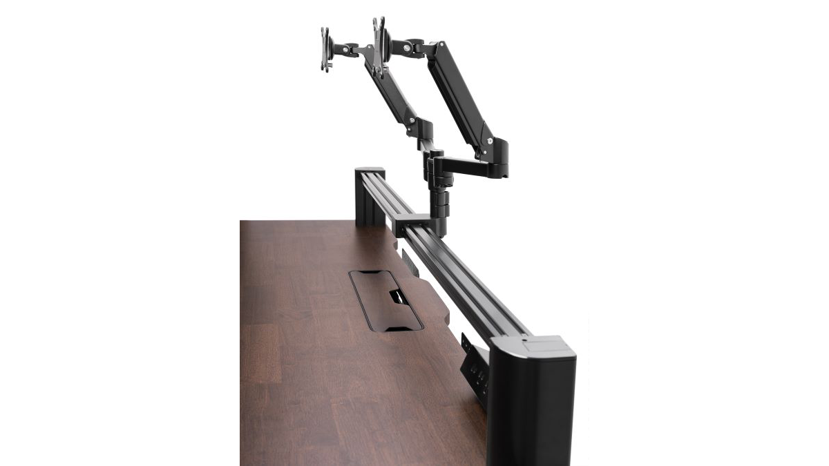 Het modulaire bureau is standaard ~180 cm breed, met de optie om de afmeting te vergroten met 30 x 70 cm (~11.8 x 27.6-in) indien nodig. Andere accessoires zijn gemotoriseerde poten om er een in hoogte verstelbaar zit-sta bureau van te maken en een railsysteem met een T-kanaal dwarsbalk, zijrails en een aan de bovenkant gemonteerde rail. Het bureau wordt geleverd met dubbele monitorarmen, zodat je de rail gemakkelijk kunt gebruiken om beeldschermen of andere accessoires zoals lampen, camera's en microfoons te monteren. Ook inbegrepen is een RapidRoute draadbeheerlade om kabels en stroomstrips te verbergen naast opbergruimte met ingebouwde USB-A en USB-C oplaadpoorten.