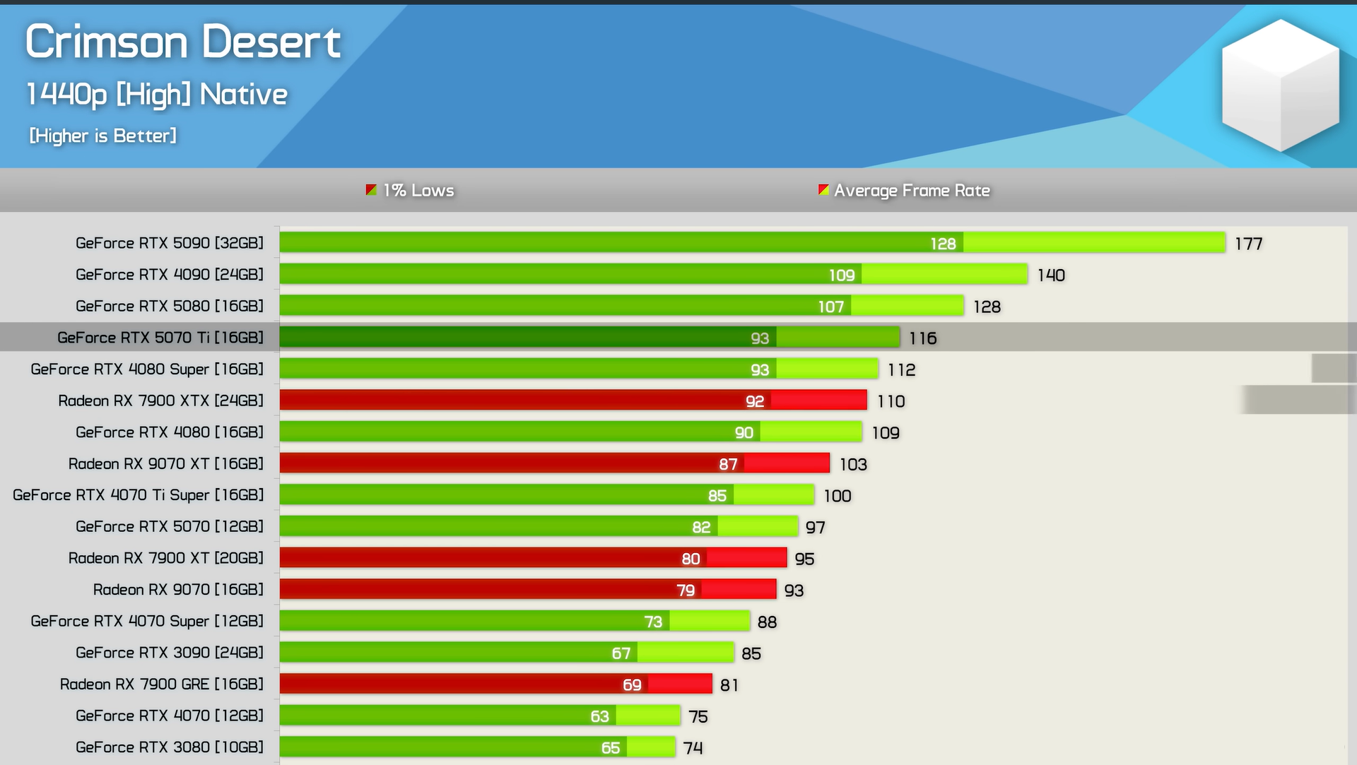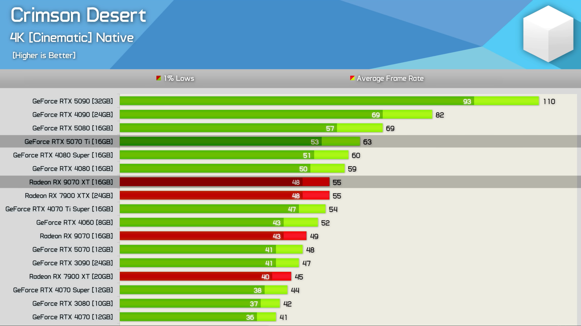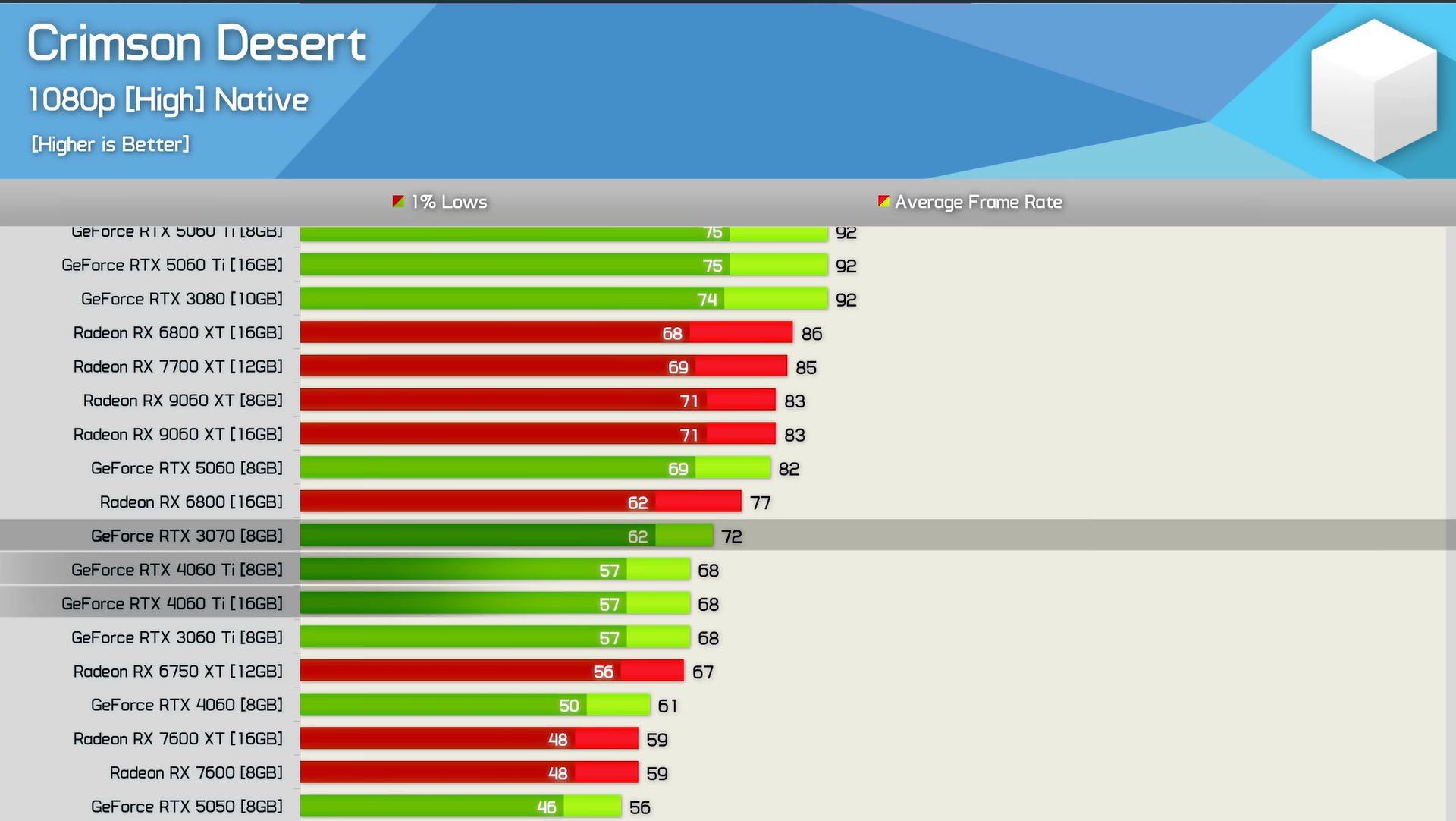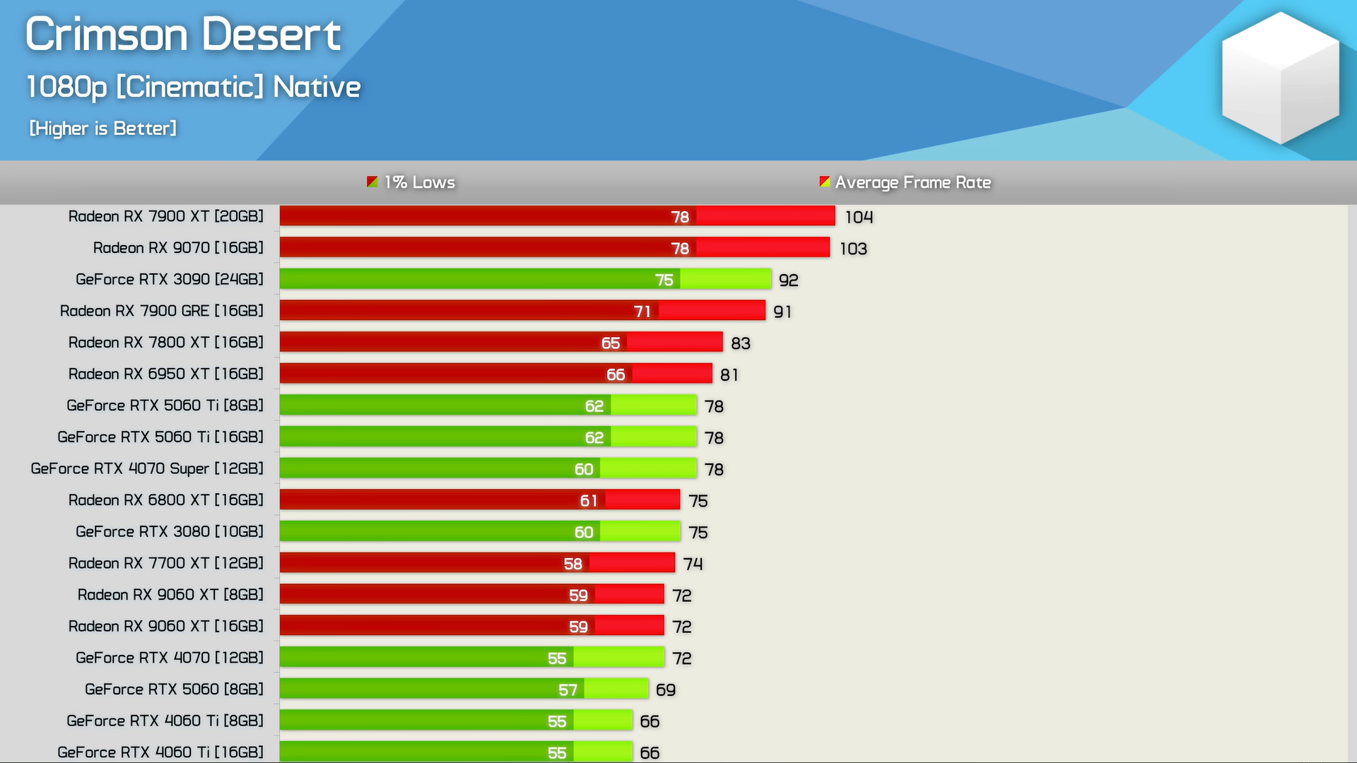 Hardware Unboxed heeft de prestaties van Crimson Desertgemeten met 40 GPU's en een Ryzen 7 9800X3D. De resultaten spreken voor zich: Crimson Desert blijkt zelfs met bescheiden GPU's zoals de RX 7600 op een stabiele 60 FPS te draaien.