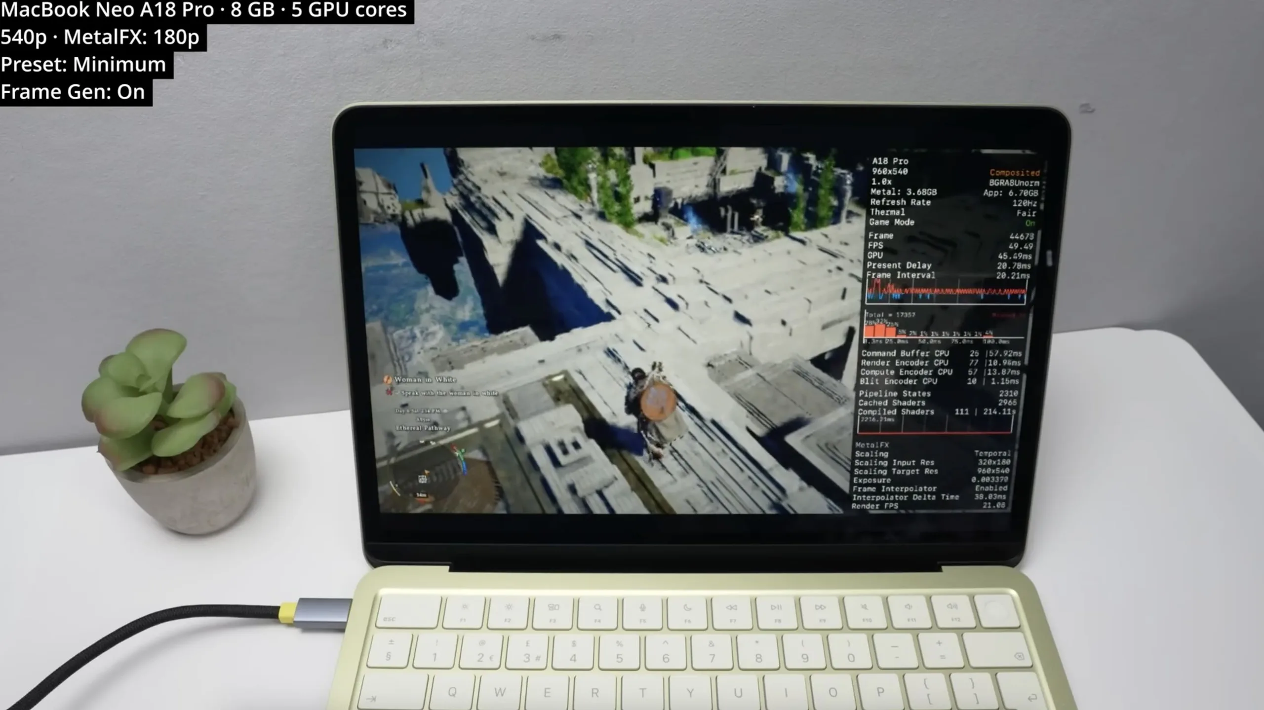 Met de minimale voorinstelling, MetalFX-upscaling van een lachwekkende 180p naar 540p en frame-generatie ingeschakeld, slaagt de MacBook Neo erin om Crimson Desert met ongeveer 50 FPS uit te voeren. Als u bedenkt dat de A18 Pro met een 5-core GPU hardwareversnelde mesh shaders heeft, lijken de prestaties bijna net zo goed te zijn als die van de M1.