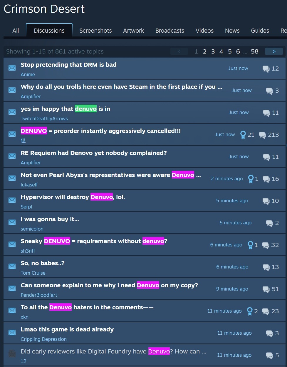 Onmiddellijk nadat dit bekend werd, werd het Steam-forum van het spel https://steamcommunity.com/app/3321460/discussions/ gedomineerd door dezelfde klacht. De meeste spelers protesteren tegen de late toevoeging van Denuvo nadat ze besloten hadden om de titel aan te schaffen. Als gevolg hiervan dreigen kopers hun Crimson Desert pre-orderswat Valve toestaat vóór de lancering.