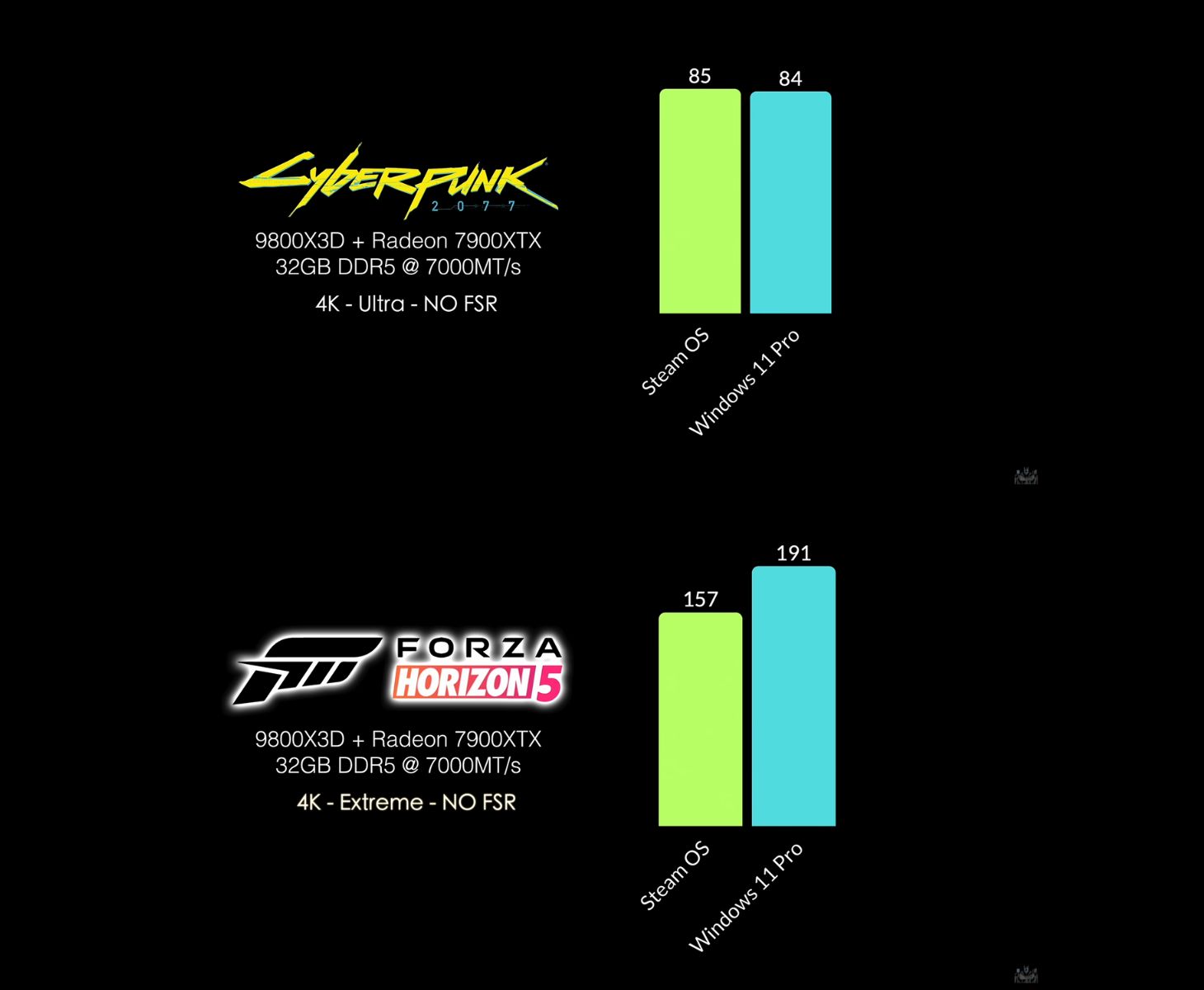 Borderlands 4 toonde een klein voordeel voor Windows 11, met een gemiddelde van 74 FPS vergeleken met de 69 FPS van SteamOS bij 4K Ultra met FSR Quality ingeschakeld. Forza Horizon 5 liet een van de grotere verschillen zien, waarbij SteamOS gemiddeld 157 FPS haalde bij 4K Extreme instellingen zonder FSR, terwijl Windows 11 191 FPS haalde. ETA Prime suggereerde dat het verschil beïnvloed kan zijn door de nauwe banden van de titel met het ecosysteem van Microsoft.