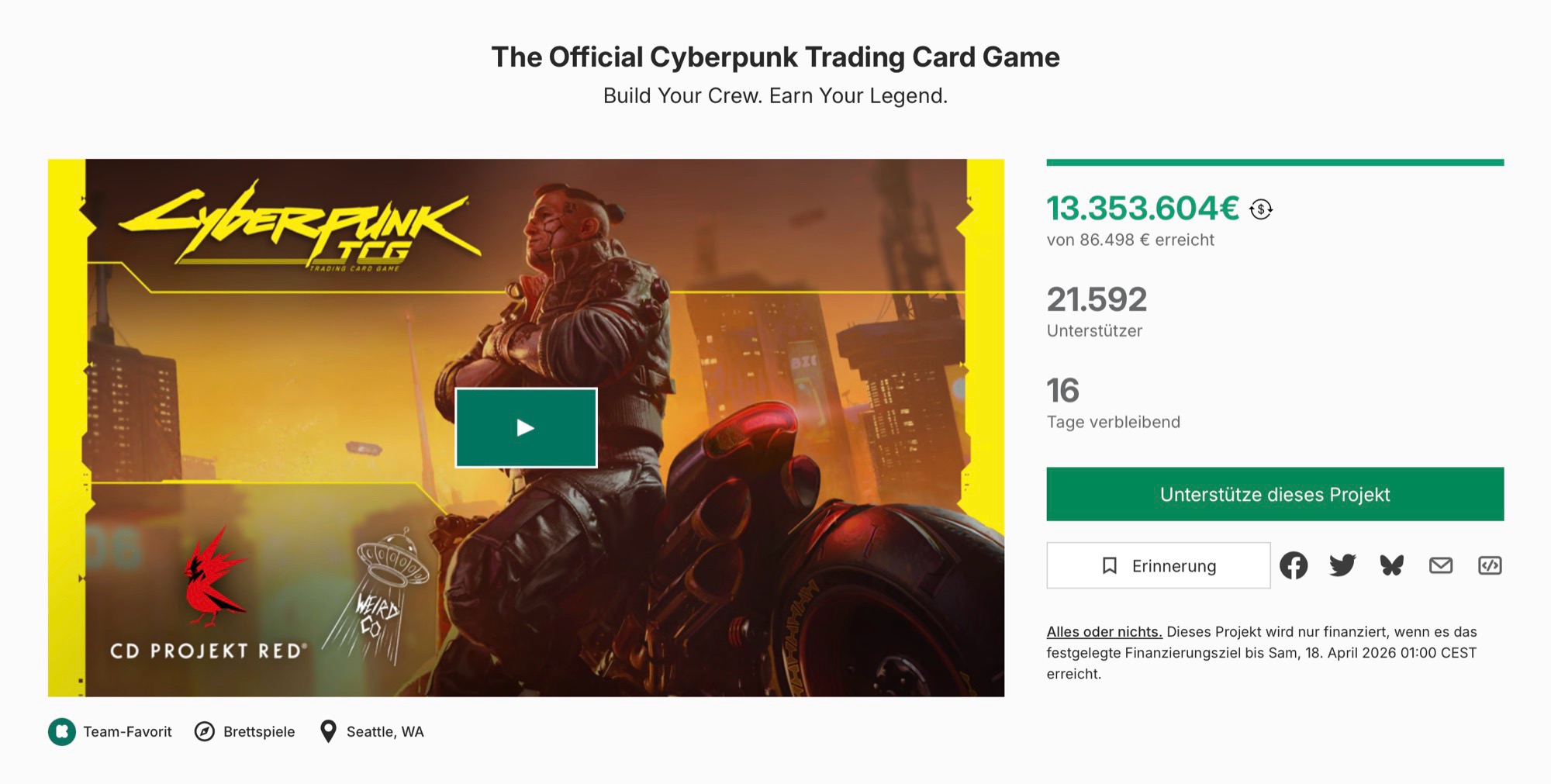 Het spel heeft meer dan $15,4 miljoen op te halen bij meer dan 21.500 klanten. Dit betekent dat Cyberpunk TCG zelfs de meeste videogames heeft overtroffenmet uitzondering van Star Citizen, dat nu bijna een miljard US dollar heeft opgehaald. WeirdCo schrijft dit succes niet alleen toe aan de kracht van het merk Cyberpunk, maar vooral aan de nauwe samenwerking met de community, die tot uiting komt in wekelijkse enquêtes die de roadmap van het spel beïnvloeden