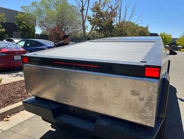 Over strak gesproken, dat is precies het uiterlijk van de remlichten van de Cybertruck. Op een foto van de remlichten direct nadat de Cybertruck van de Semi-trailer is gelost, zijn twee vierkante remlichten te zien en een derde balk onder de tonneau-cover op de laadklep van de truck.