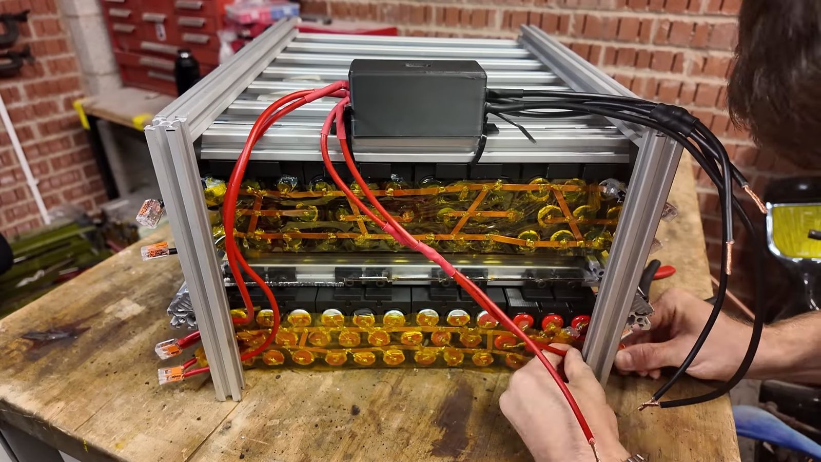 Toen de batterijen klaar waren, maakte hij 3D-printframes voor groepen van negen parallel geschakelde batterijen; deze groepen werken net als modules in EV-batterijpacks. Vervolgens verbond hij de modules tot een accupakket.
