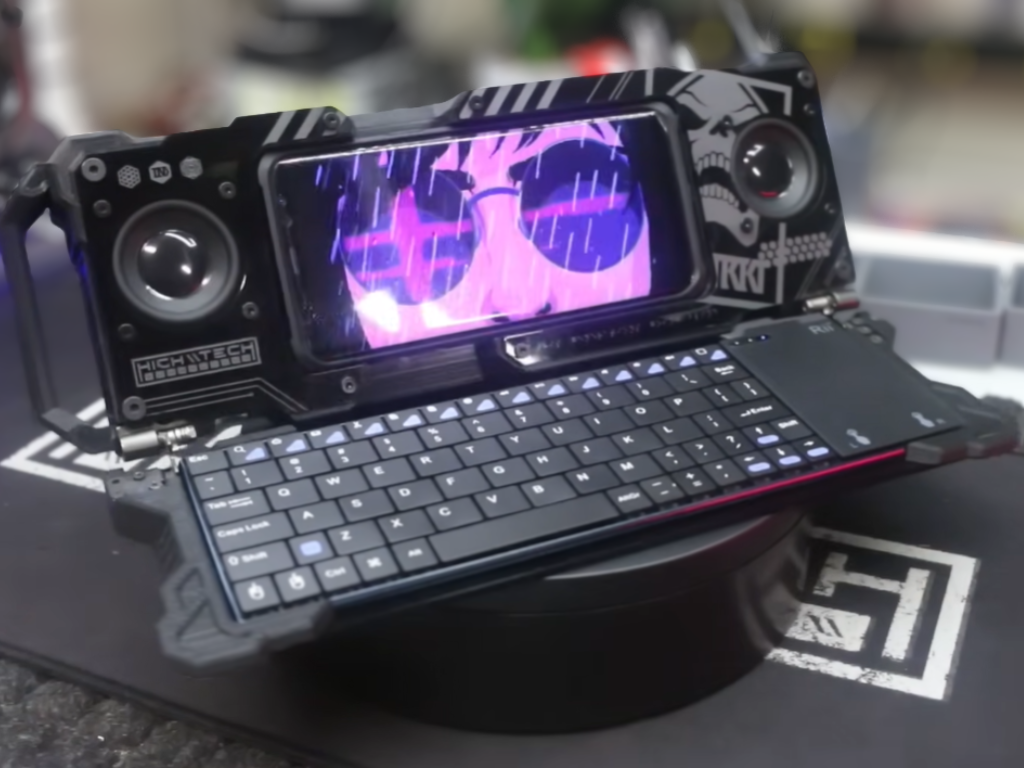 Het geheel wordt van stroom voorzien door een robuuste 10.000 mAh powerbank om alles opgeladen te houden tijdens lange game- of filmsessies. Het cyberdeck ontvouwt zich via een scharnierend clamshell-ontwerp, vergelijkbaar met een laptop. Het kan ook worden opengevouwen tot een indrukwekkende 180 graden.