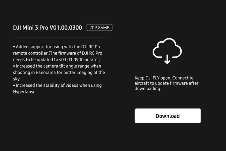Bovendien waarschuwt DJI dat u de firmware van uw RC Pro-afstandsbediening moet hebben bijgewerkt tot ten minste V03.01.0900 voordat u deze kunt gebruiken met een Mini 3 Pro-drone. Bovendien beweert DJI dat V01.00.0300 de videostabiliteit in de Hyperlapse-modus heeft verbeterd, evenals de Panorama-beeldkwaliteit door het vergroten van het kantelhoekbereik van de camera. De nieuwste software-update van de Mini 3 Pro kan nu worden gedownload als een bestand van 209,86 MB.