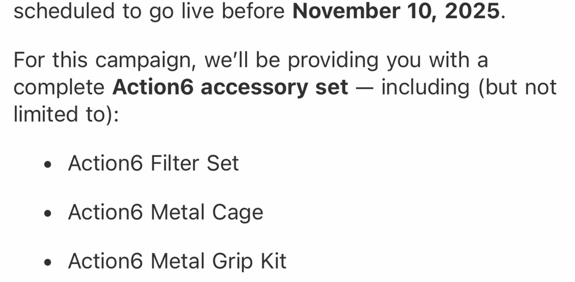 Dit variabele diafragma is ongehoord voor een actiecamera, en wordt vergezeld door een 1.950 mAh batterij die volgens de geruchten een batterijlevensduur tot 4 uur kan bieden. Het gerucht gaat dat al deze hardware ook in de VS zal beginnen bij ongeveer $329. Volgens De Nieuwe Camerastaat er iets dat met de Osmo Action 6 te maken heeft "gepland om voor 10 november 2025 live te gaan". Men kan dus redelijkerwijs verwachten dat DJI de Osmo Action 6 ergens begin volgende maand officieel zal presenteren.
