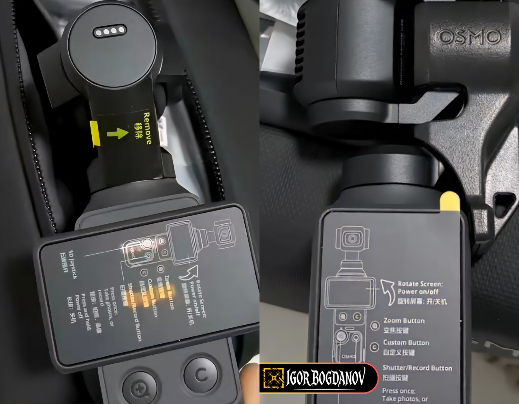 De nieuwste DJI Osmo Pocket 4 foto lekken (opgeschaald met Gemini), tonen de tekst op de beschermende gidsstickers van de vlogging camera gimbal, en bevestigen de functionaliteit achter de nieuwe knoppen.