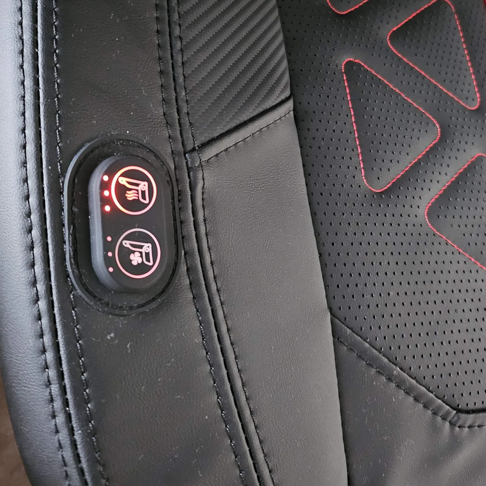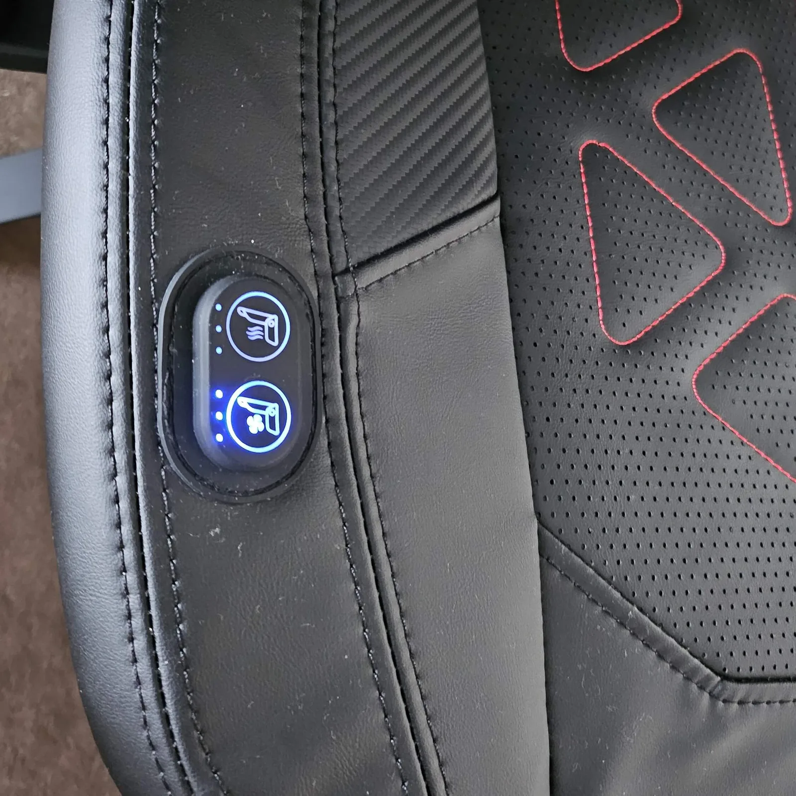 Voor de test heb ik mijn vorige gamestoel, een Noblechairs Epic, twee weken lang ingeruild voor de Martian Pro en hem voor mijn dagelijkse werk gebruikt. Vanwege de zomerse temperaturen heb ik de stoelverwarming alleen op proef getest: de stoel warmde al na een paar seconden op en kon op drie niveaus worden ingesteld, tot zeer warm. De stoelventilatie was meer geschikt voor het seizoen. Ook met drie standen kreeg ik eigenlijk erg koele benen bij de derde stand, ondanks een kamertemperatuur van 28 graden, dus ik heb hem teruggezet naar stand 2. Maar het is fijn om te weten dat hij indien nodig kan worden afgekoeld. De knoppen bevinden zich aan de rechterkant van de zitschaal. Met mijn gemiddelde slanke postuur zijn ze nog steeds duidelijk zichtbaar en worden ze niet bedekt. Hierdoor kon ik ook zien wat ik had ingesteld met behulp van de 1-2-3 rode of blauwe stippen, wat een erg mooie en beknopte oplossing was.