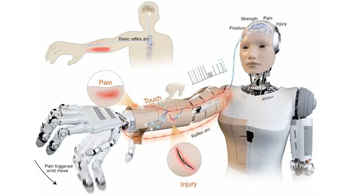 De onderzoekers zijn verbonden aan de City University van Hong Kong. Hun neuromorfische robotic electronic (NRE) huid brengt humanoïden dichter bij mensen door ze in staat te stellen aanrakingen te voelen, op stimulatie te reageren en beschermende reflexen te activeren.