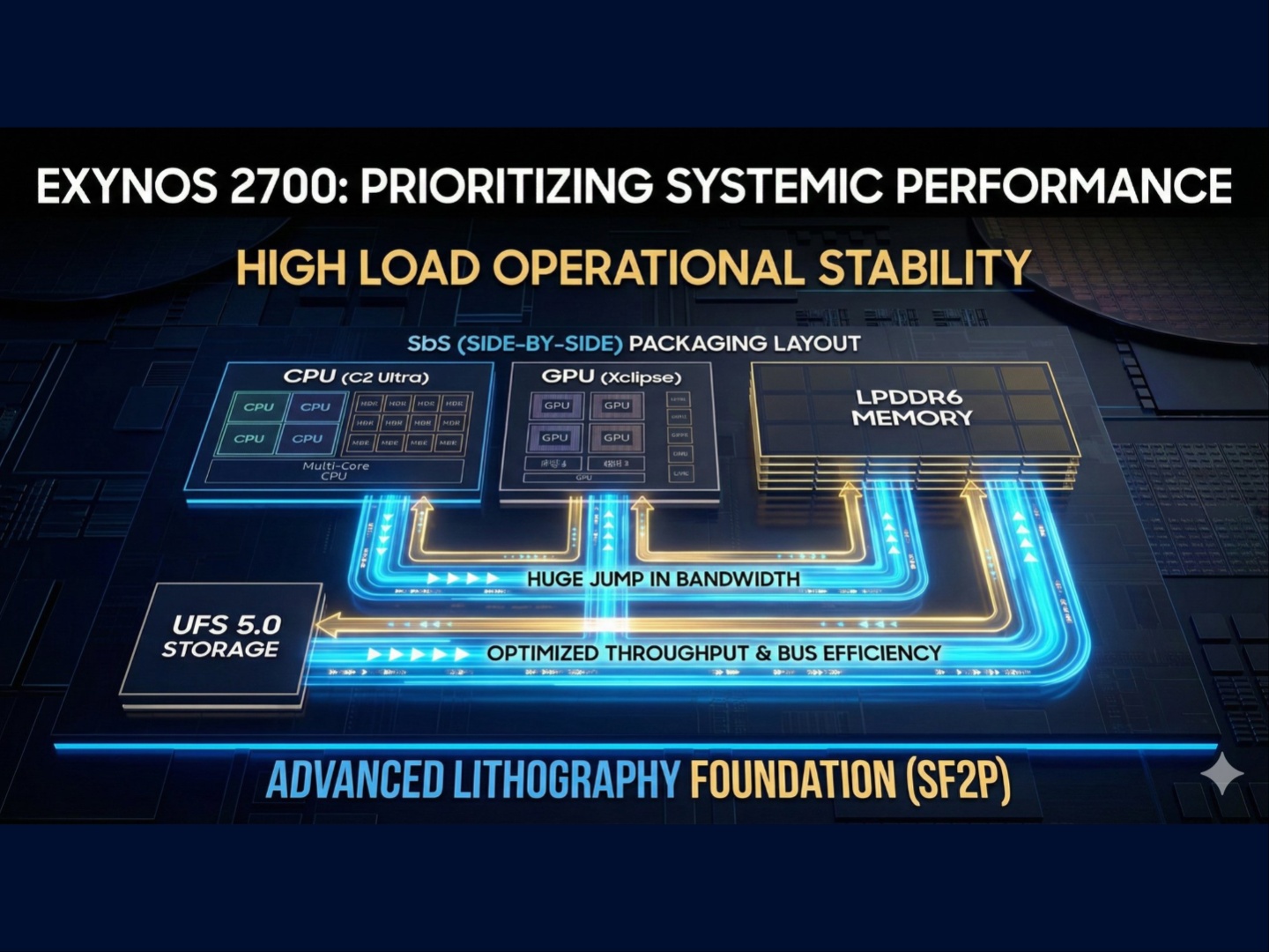 Wat betreft de geschatte Geekbench-scores scoort de Exynos 2700 naar verluidt 40% hoger in single-core prestaties en 30% hoger in multi-core prestaties vergeleken met de Exynos 2600. Het maakt ook gebruik van een uniform koperen Heat Path Block (HPB) in een FOWLP-SbS (Side-by-Side) verpakkingsontwerp, een upgrade ten opzichte van de eerste generatie voor de Exynos 2600. Hierdoor komt het DRAM naast de chip te liggen, waarbij het koellichaam (HPB) beide componenten bedekt. Samen met de CPU krijgt ook de volgende generatie Xclipse GPU een upgrade met ongeveer 80% tot 100% snellere gegevensoverdracht van het LPDDR6 RAM en UFS 5.0 opslag, wat tot 40% prestatiewinst oplevert.