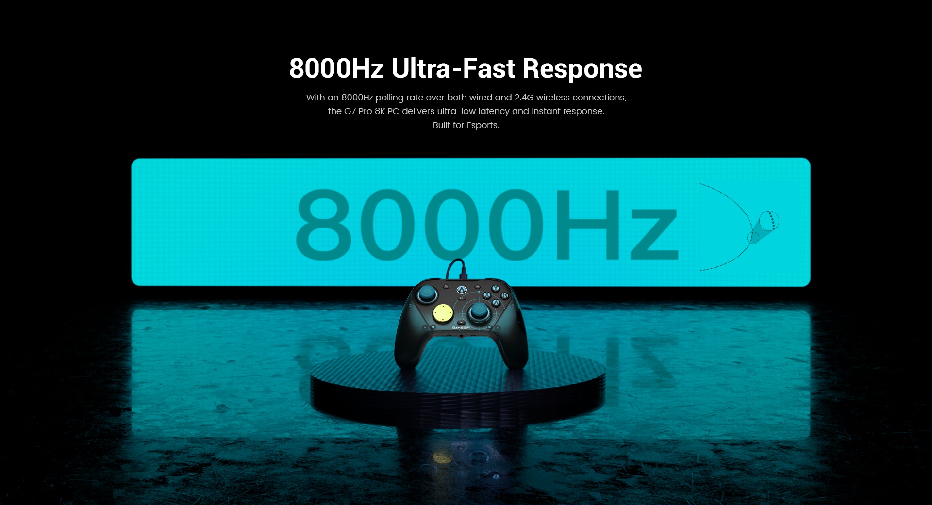 De G7 Pro 8K PC Aimlabs Edition draadloze controller heeft niet alleen een aangepast ontwerp, maar gebruikt ook een tweede generatie Mag-Res TMR sticks die soepeler zijn, een meer lineaire besturing hebben en een ultralaag stroomverbruik hebben. De nieuwe controller heeft ook een 8.000Hz polling rate bij gebruik in bedrade en 2,4GHz draadloze modus, vergeleken met de 1000Hz polling rate van de standaardversie.