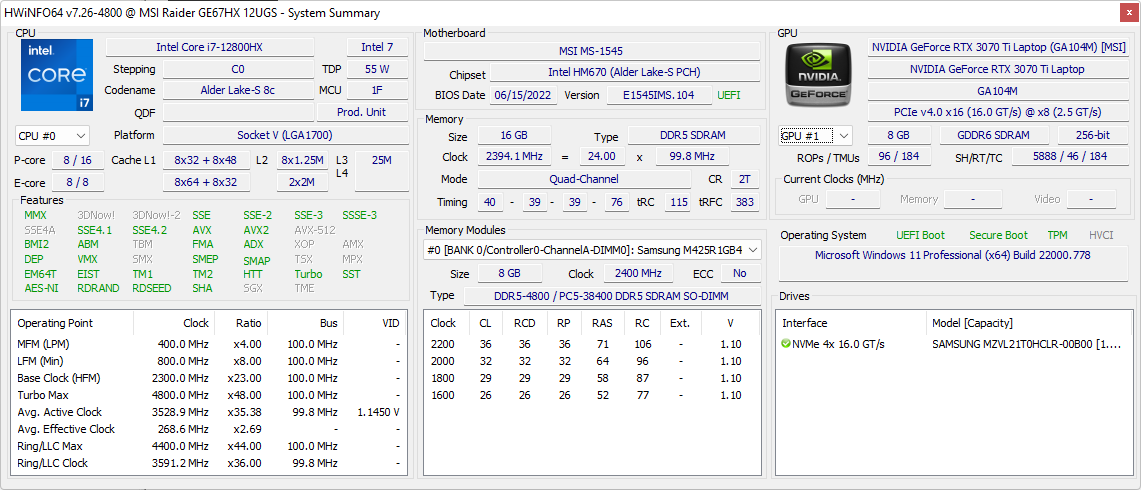 | MSI GE67 HX 12UGS i7-12800HX, GeForce RTX 3070 Ti Laptop GPU, Samsung PM9A1 MZVL21T0HCLR, OLED, 1920x1080, 15.6" | MSI Raider GE66 12UHS i9-12900HK, GeForce RTX 3080 Ti Laptop GPU, Samsung PM9A1 MZVL22T0HBLB, IPS, 3840x2160, 15.6" | MSI Vector GP66 12UGS i9-12900H, GeForce RTX 3070 Ti Laptop GPU, , IPS, 1920x1080, 15.6" | Asus ROG Strix Scar 15 G533ZW-LN106WS i9-12900H, GeForce RTX 3070 Ti Laptop GPU, Samsung PM9A1 MZVL22T0HBLB, IPS-level, 2560x1440, 15.6" | Alienware m15 R6, i7-11800H RTX 3080 i7-11800H, GeForce RTX 3080 Laptop GPU, Samsung PM9A1 MZVL21T0HCLR, IPS, 1920x1080, 15.6" | Razer Blade 15 2022 i7-12800H, GeForce RTX 3080 Ti Laptop GPU, SSSTC CA6-8D1024, IPS, 2560x1440, 15.6" | |