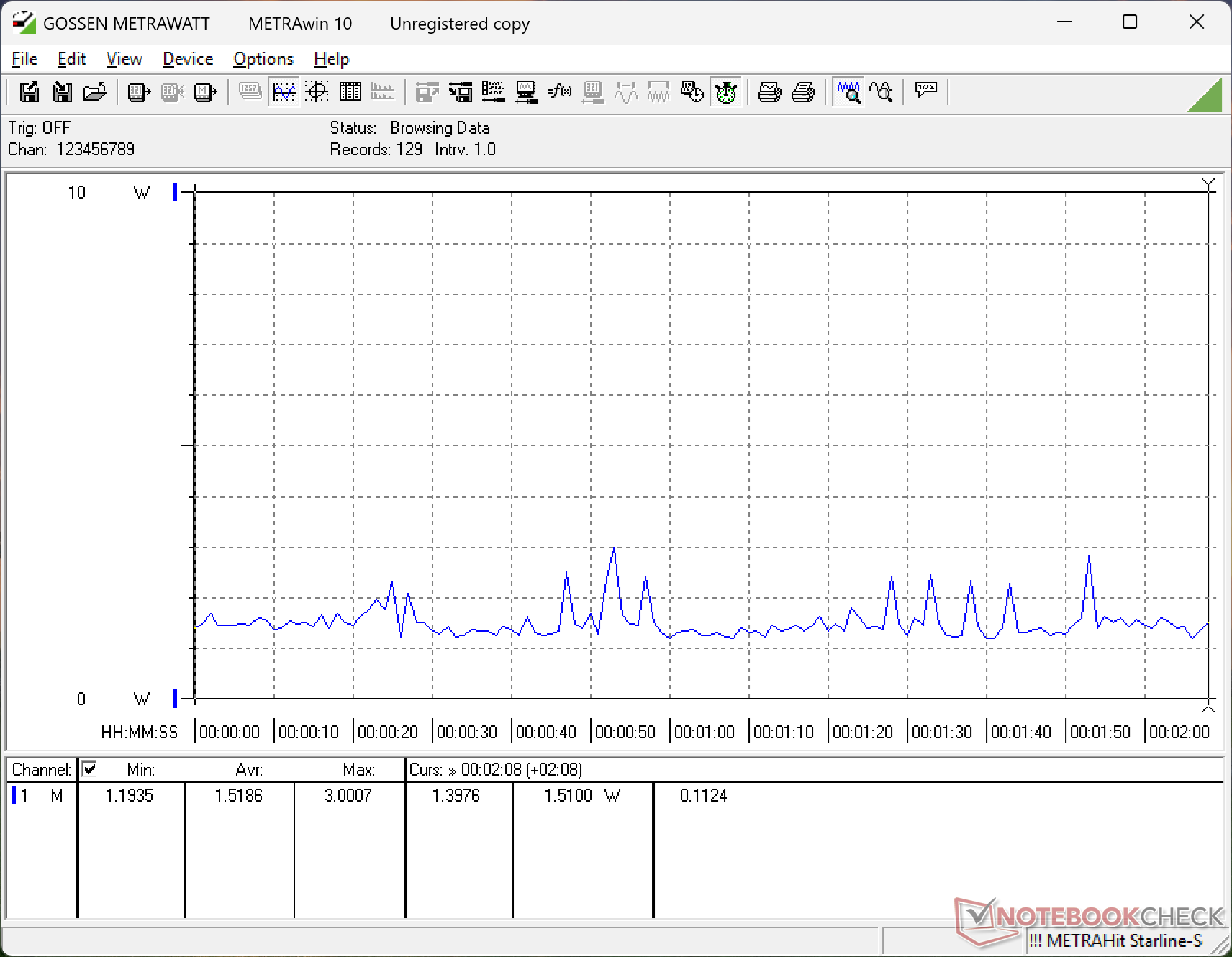 De grafiek hieronder toont het stroomverbruik van de XPS 16 FHD+ configuratie over een periode van twee minuten bij stationair draaien op het bureaublad op de laagste helderheidsinstelling en met VRR ingeschakeld. Het systeem verbruikt gemiddeld slechts 1,5 W, wat zeer indrukwekkend is voor een groot 16-inch scherm. Concurrerende modellen zoals de Asus ZenBook S16 of MSI Prestige 16 zouden onder vergelijkbare omstandigheden elk tussen de 3 W en 5 W verbruiken.