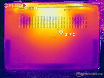 Het temperatuurprofiel van het oppervlak is meestal symmetrisch dankzij de symmetrische koeloplossing binnenin. Toch is de hotspot in het midden van het toetsenbord niet warmer dan op de oudere Latitude 9430 2-in-1 rond de 36 tot 38 C bij veeleisende belastingen, terwijl de concurrerende ThinkPad X1 Yoga G8 iets warmer is. De gemiddelde temperatuur tijdens browsen of videostreaming is echter merkbaar warmer dan op het model van vorig jaar, maar niet oncomfortabel hoog.