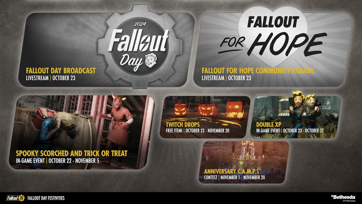 Zoals vermeld zal de uitzending van Fallout Day op 23 oktober om 9:00 PM CEST (dat is 3:00 PM EST en 12:00 PM PST) worden gestreamd. De Fallout Day festiviteiten zullen worden gestreamd vanuit de Bethesda Game Studios in Austin, en mensen kunnen kijken op Bethesda's Twitch kanaal en ook wat Twitch-drops meepikken.