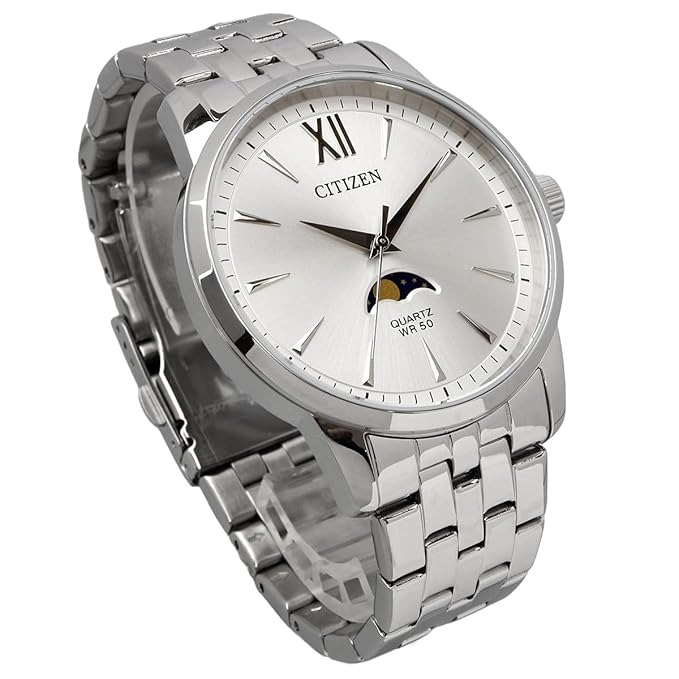 Het instapmodel van Citizen met maanfase is een slank, gekleed horloge met 3 wijzers (zilverkleurige wijzerplaat) met kalender- en maancomplicaties. Het wordt meestal verkocht voor ongeveer $100-120. De stijl is eenvoudig en vrij elegant: een zilverkleurige kast en bijpassende stalen armband, met een symmetrische tri-compax wijzerplaat (dag, datum, 24u/maan). Zoals Walmart meldt, heeft het een quartz-uurwerk en is het waterbestendig tot 5 ATM (50 m), genoeg voor dagelijks gebruik. Bij deze Citizen draait alles om understatement - het meest opvallende kenmerk is een subdial die de maanfase weergeeft - waardoor het een super subtiel maar functioneel horloge is voor op kantoor of in een jurk.