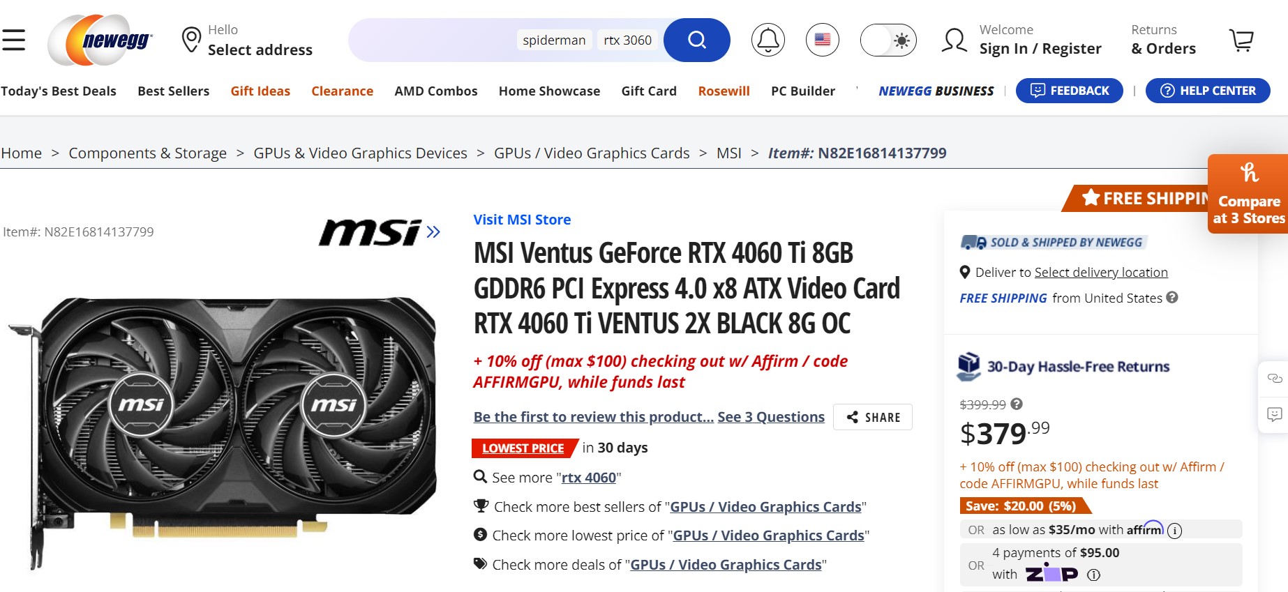 Met dit in gedachten was het waarschijnlijk dat de RTX 4060 Ti een prijsdaling zou ondergaan. Het blijkt dat de prijs van de RTX 4060 Ti al aan het dalen is, want MSI heeft de prijs van de MSI Ventus GeForce RTX 4060 Ti 8 GB met 5% of ongeveer US$20 verlaagd bij verschillende retailers (via VideoCardz). Je kunt de kaart vinden voor US$379.99 op Newegg, Amazonen B&H Photo.