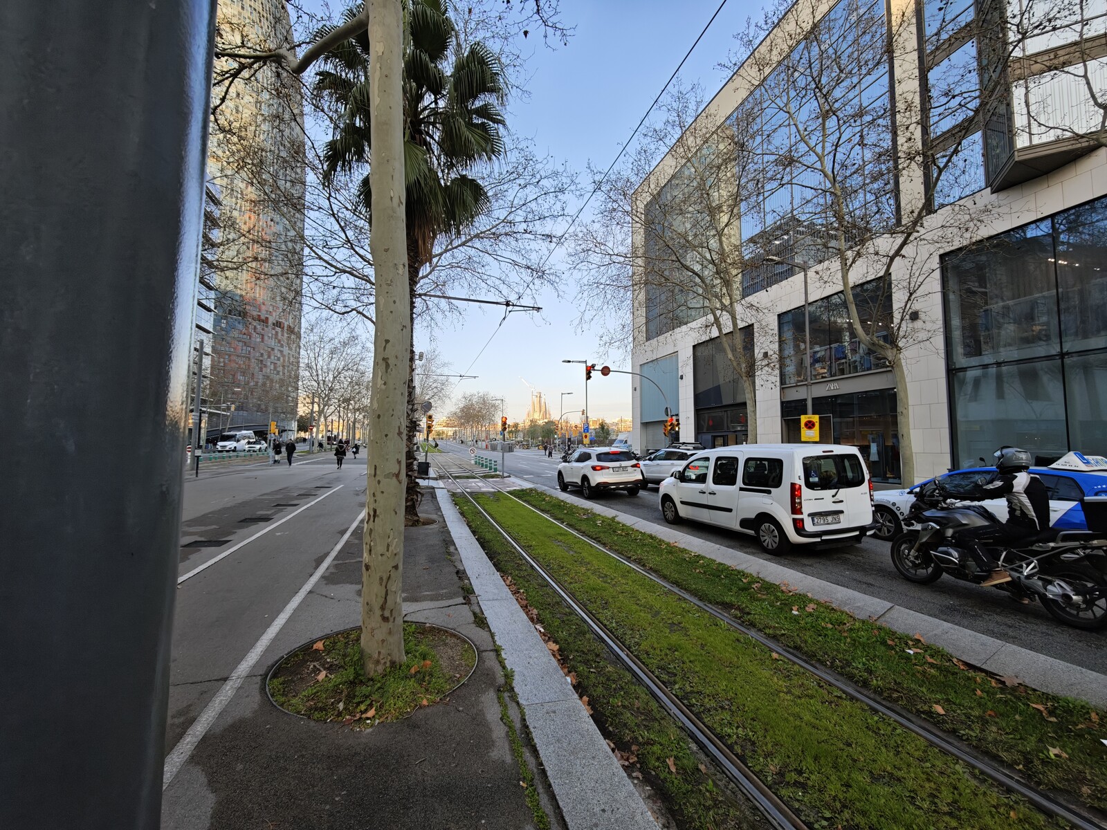 Zoals veel grote straten in Barcelona biedt de Avenida Diagonal in het midden een brede promenade voor voetgangers en fietsers, omzoomd met platanen. Opnieuw biedt de Xiaomi-smartphone hier het scherpere beeld in detail, waarbij beide smartphones een goed beeld geven van de kraanarm aan de rechterkant met zijn fijne steunpoten.