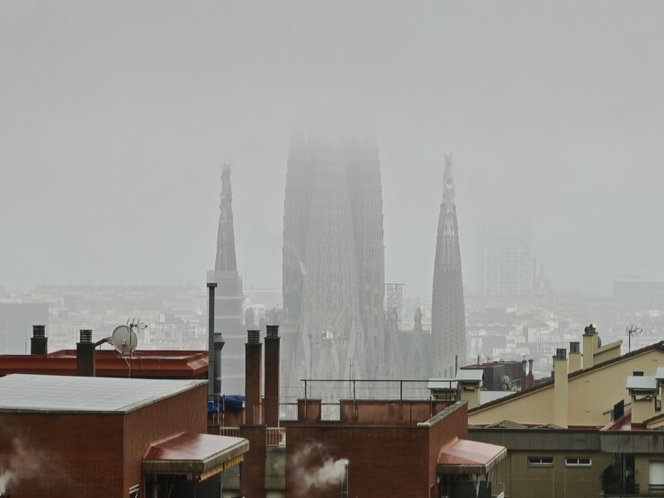 Zelfs in Barcelona is het weer niet altijd zonnig: op onze eerste excursie hangt er nog ochtendmist over de stad. Hierdoor ligt ook de Sagrada Familia kerk in de schaduw, een van de belangrijkste werken van architect Antoni Gaudí.