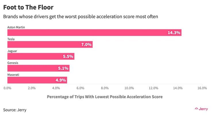 Wat de rijgewoonten van de typische Tesla-eigenaar betreft, zegt Jerry dat ze "genieten van versnellingen, maar niet van hoge snelheden, en dat ze beter dan gemiddeld hun handen van hun telefoon afhouden tijdens het rijden". Kinderen van het elektrische autotijdperk inderdaad, want de meeste EV's hebben grote infotainmentschermen en zitten vol connectiviteitsopties, wat de drang en noodzaak om telefoons zo vaak te gebruiken enigszins compenseert.