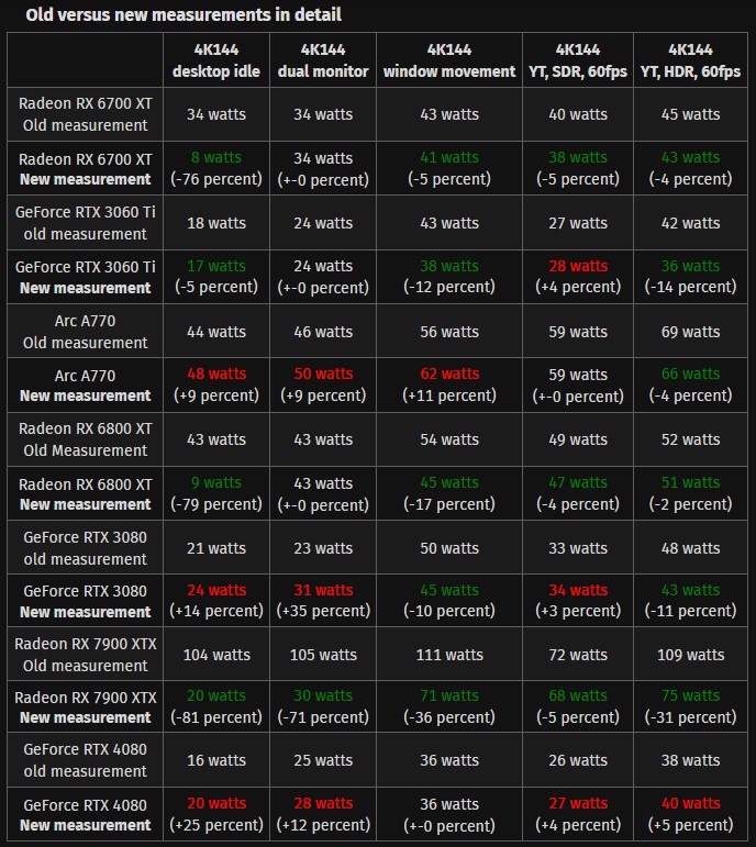 ComputerBase verklaart het merkwaardige resultaat door te melden dat de nieuwe verbruikscijfers in ruststand werden gemeten terwijl de publicatie opnieuw tests uitvoerde voor de stroomopname tijdens het gamen met behulp van de nieuwe Powernetics V2. Aangesloten op een 4K 144 Hz VRR monitor, AMDrDNA 3 GPU's een opmerkelijke vermindering in stroomverbruik wanneer de AMD Adaptive Sync was ingeschakeld. Waar de RX 7900 XTX 104 W verbruikte met Adaptive Sync uitgeschakeld, had de kaart slechts 20 W nodig. Ook de RX 7900 XT vertoonde een verrassend lager verbruik van slechts 17 W. Dit gedrag vertaalde zich ook naar dubbele monitoren met VRR-ondersteuning.