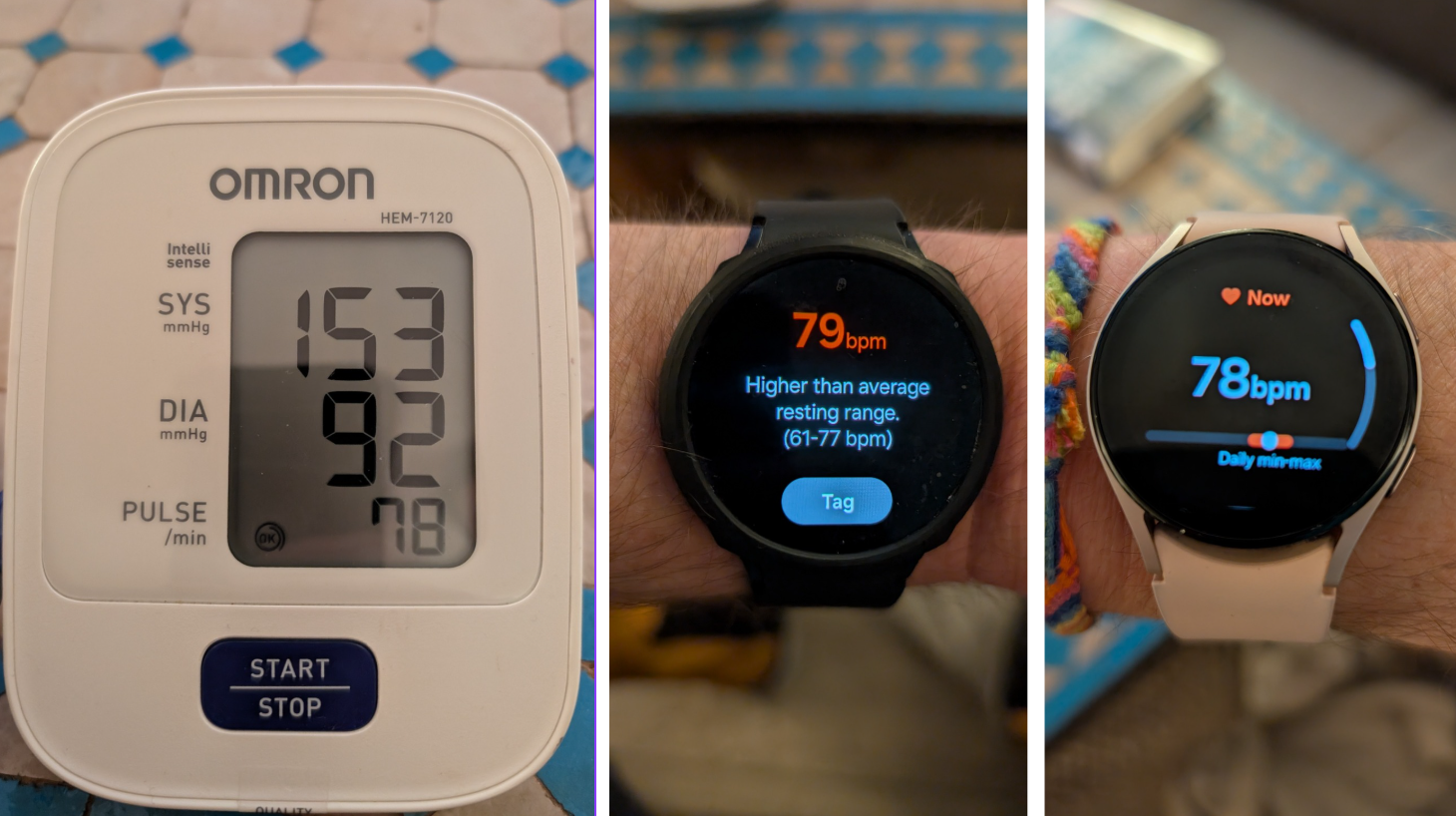 Ik heb geen toegang tot medische apparatuur, maar ik heb wel een klinisch gevalideerde Omron HEM-7120 bloeddrukmeter die ook de hartslag meet, een hometrainer met hartslagmonitor en een Galaxy Watch 5 ter vergelijking. Nu mijn vrouw stand-by staat met de camera, is het tijd om te vergelijken.