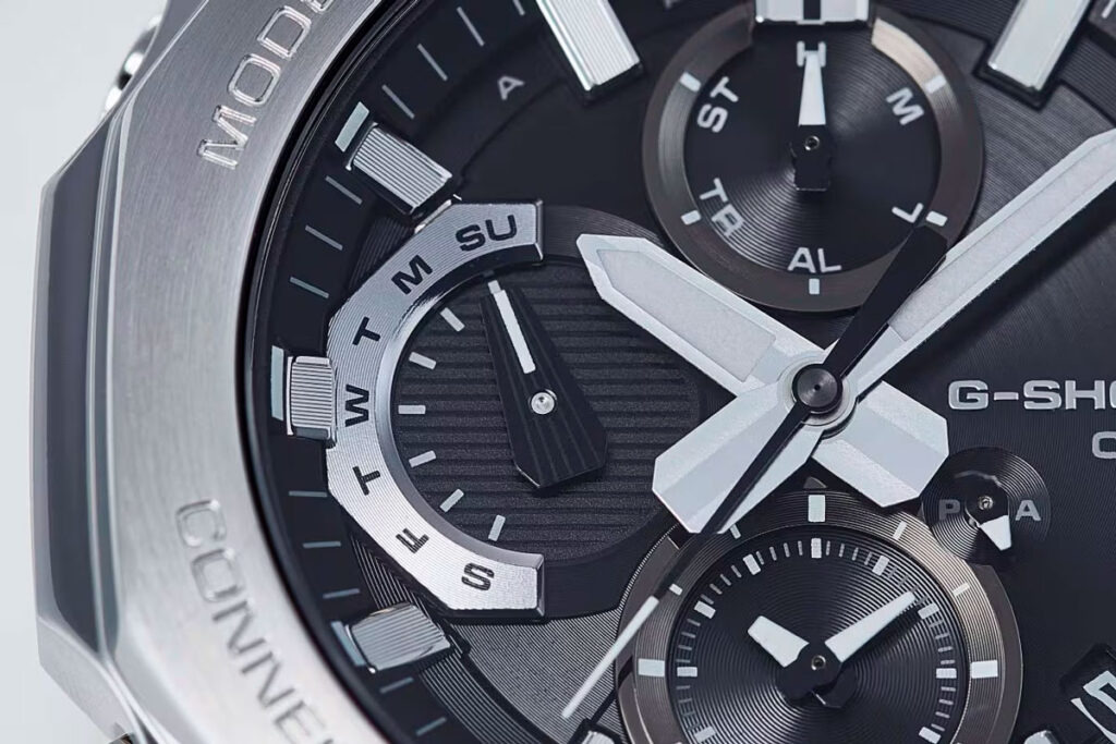 De wijzerplaat is waar de meeste zichtbare veranderingen zitten. De lay-out is analoog met drie subdials, maar de texturen zijn hier duidelijker zichtbaar. Het oppervlak van de wijzerplaat lijkt gelaagd, met een mix van radiale borstels en gedessineerde gedeelten. De dagaanduiding rond 9 uur maakt gebruik van een uitgesneden display, terwijl de subdials een contrasterende afwerking hebben. Het ontwerp van de wijzers wordt ook veel duidelijker in deze renders. Het contrast tussen de wijzers en de wijzerplaat ziet er enigszins ingehouden uit, wat de zichtbaarheid kan beïnvloeden afhankelijk van de belichting, maar dat is moeilijk te bevestigen op basis van renders alleen.