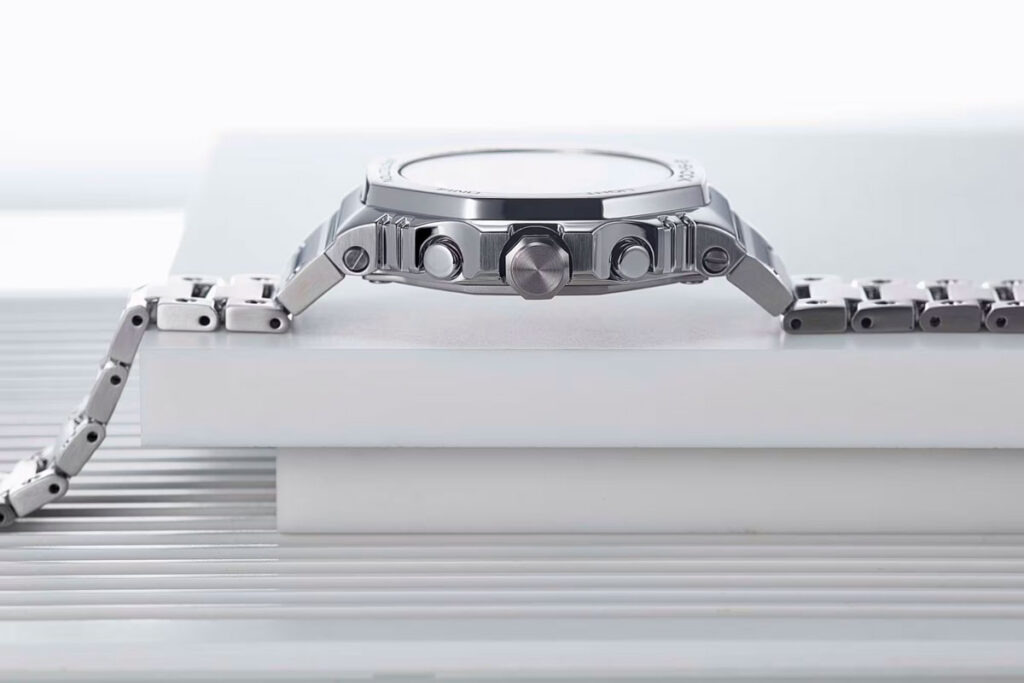 De roestvrijstalen kast en armband zijn nu zichtbaar vanuit meerdere hoeken. De bezel heeft een consistente geborstelde afwerking, en de randen van de kast en de schakels lijken veel scherper dan in de eerdere render. Het algehele profiel lijkt relatief slank voor een metalen G-Shock, en de proporties lijken vrij veel op bestaande GMC-B2100 modellen, alleen al op basis van afbeeldingen.