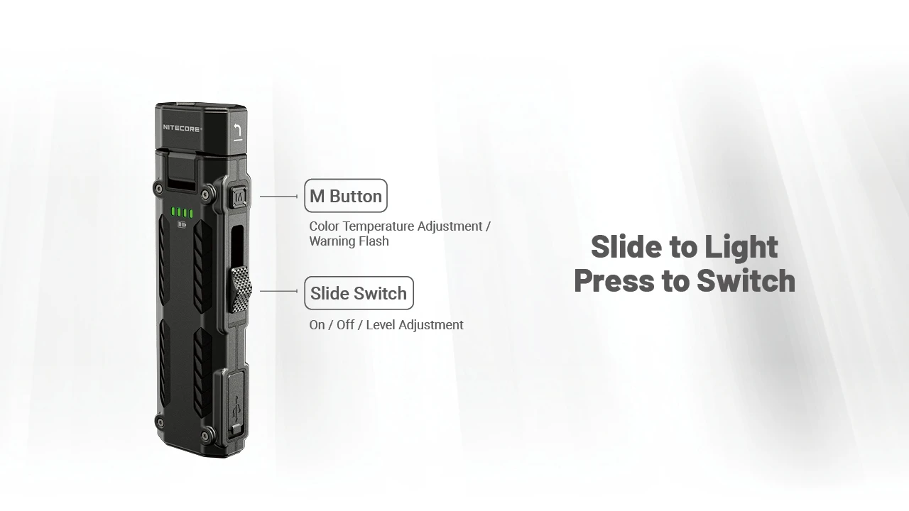 De EDC is voorzien van MCT (Multicolor Turntable), waarmee u de lichtkleur kunt veranderen door twee LED-types te mengen. Dit is vergelijkbaar met de Tini 3 (beoordeling, alleen in het Duits). U kunt kiezen tussen 3.000, 4.500 en 6.500 Kelvin. Nitecore geeft ook CRI-waarden (Color Rendering Index). Het warme licht van 3.000 Kelvin is bijzonder goed met een CRI van 97. Het neutraal witte en koel witte licht hebben CRI's van respectievelijk 83 en 73. U kunt tussen de twee modi schakelen door simpelweg op een speciale knop aan de zijkant te drukken. Als u de schakelaar ingedrukt houdt, wordt een waarschuwingslampje van 5 Hz geactiveerd. Het licht zelf wordt in drie fasen geactiveerd met een schuifschakelaar, zoals op de EDC17.