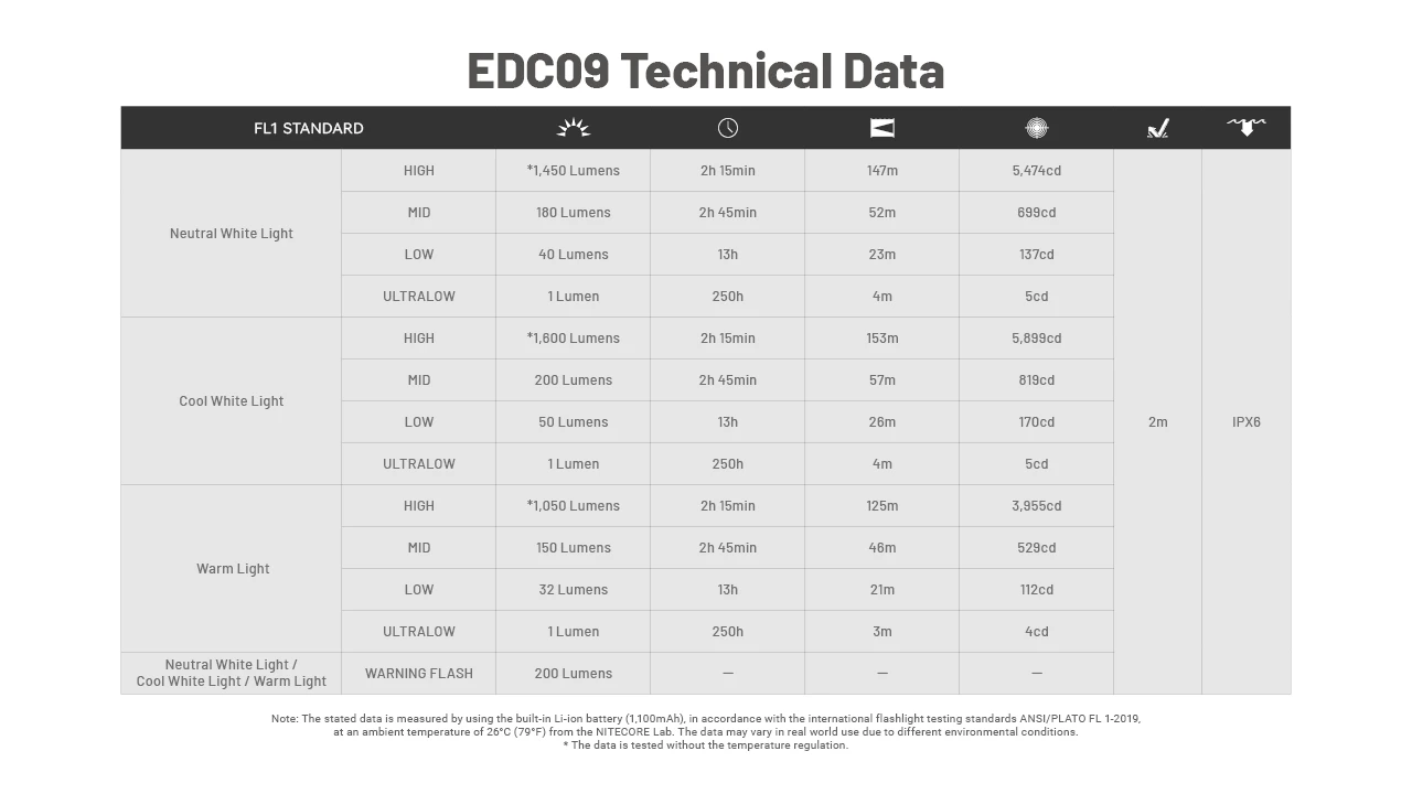 De zaklamp heeft een IPX6-classificatie, is iets langer dan 10 cm en weegt 114 gram, inclusief batterij. De batterij is niet vervangbaar en wordt opgeladen via USB-C, waardoor de zaklamp tijdens het opladen gebruikt kan worden. De batterij gaat 2 uur en 15 minuten mee in de helderste stand en 250 uur in de zwakste stand, ongeacht de kleur van het licht. Het bereik en de helderheid worden echter beïnvloed door de lichtkleur. U vindt de gegevens in de onderstaande tabel van de fabrikant.