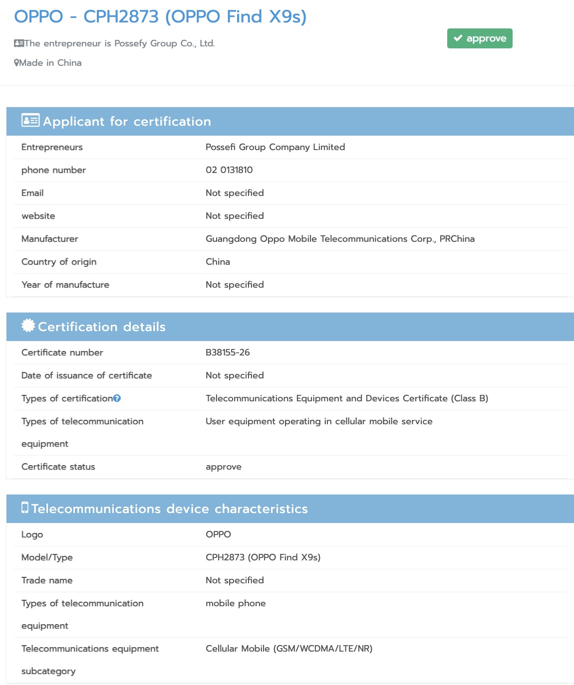 De Oppo Find X9s met modelnummer "CPH2873" onlangs gecertificeerd door de Thaise regelgevende instantie NBTC. Dit wijst erop dat de Find X9s wereldwijd gelanceerd zou kunnen worden, in tegenstelling tot de Find X8sdie beperkt was tot de Chinese markt.