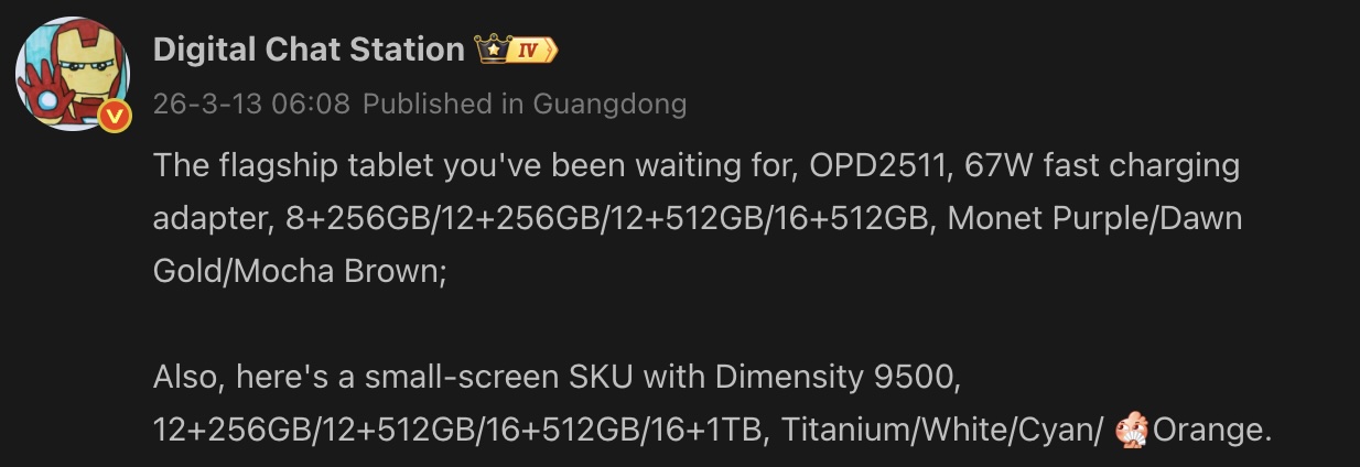 Eén daarvan is een tablet die het modelnummer "OPD2511" draagt Het lek onthult echter niet de exacte naam van het apparaat. De tipgever onthulde dat het apparaat in vier geheugenconfiguraties zal worden geleverd: 8GB/256GB, 12GB/256GB, 12GB/512GB en 16GB/512GB. Het aankomende Oppo vlaggenschip zal naar verluidt verkrijgbaar zijn in de kleuren Monet Purple, Dawn Gold en Mocha Brown. Het lek wijst ook op ondersteuning voor snelladen van 67 W.