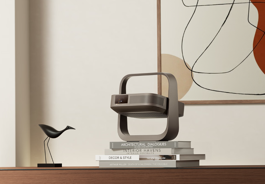 De projector heeft een afwerking in Mokka Bruin en legt de nadruk op draagbaarheid met een gewicht van 1,5 kg en een dikte van slechts 7,8 cm. Een belangrijk kenmerk van het ontwerp is een ingebouwd scharnier in gimbalstijl, waarmee de projector 150 graden kan worden gekanteld. Hierdoor kan het scherm gemakkelijk op verschillende oppervlakken worden geprojecteerd, waaronder muren en plafonds, zonder dat er extra montageapparatuur nodig is.