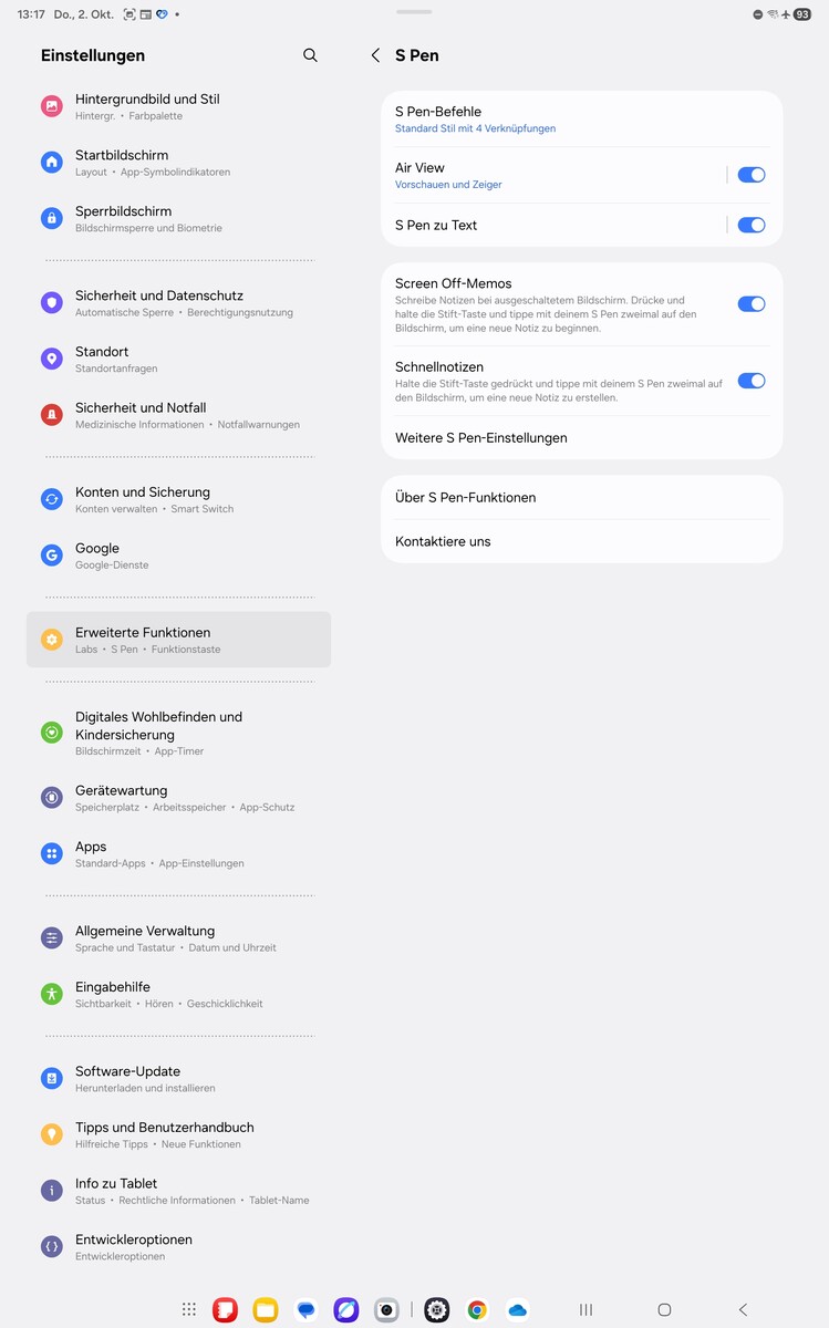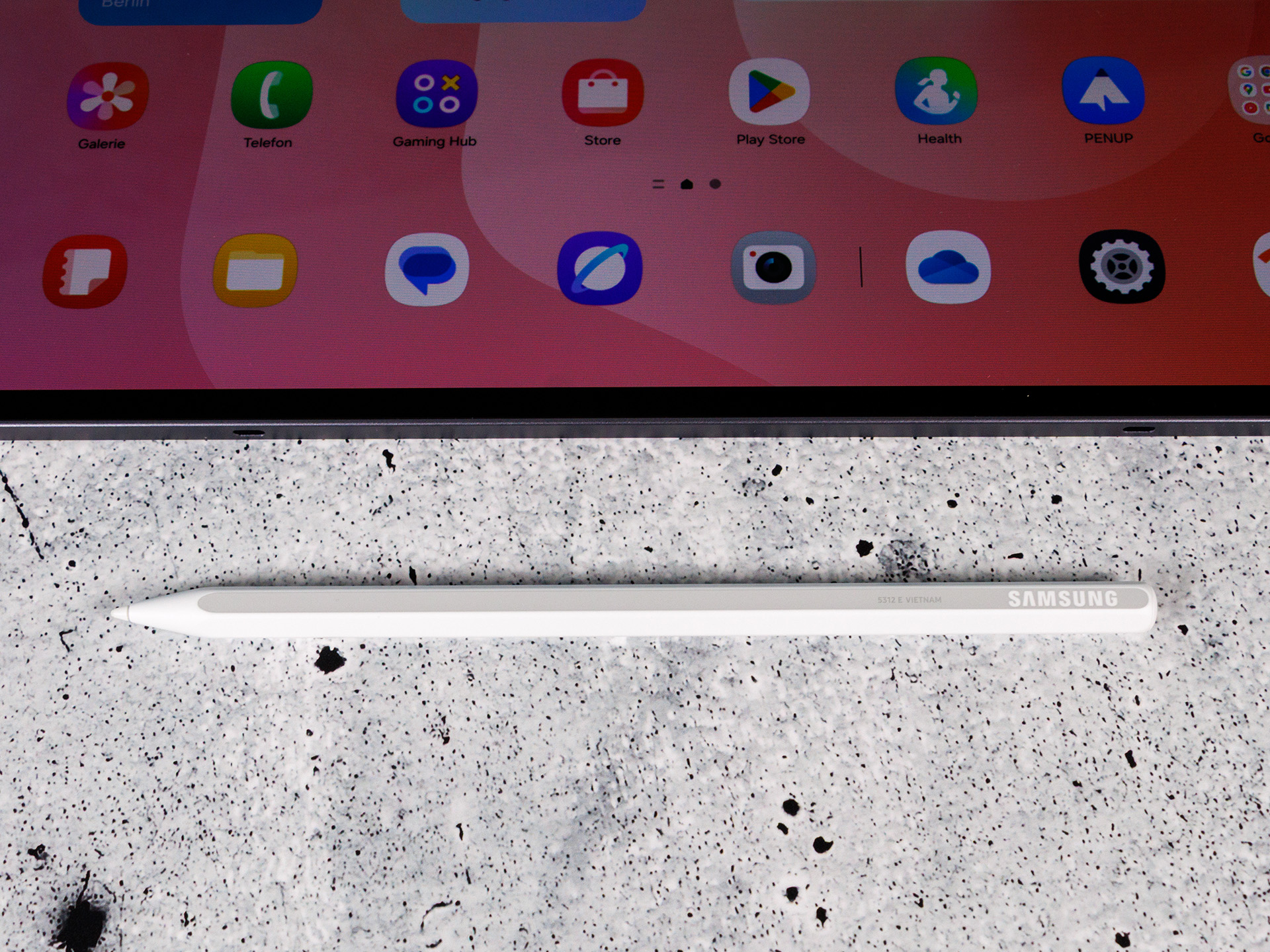 De S Pen is ook weer aan boord, maar het magnetische bevestigingsoppervlak bevindt zich nu aan de bovenrand in plaats van aan de achterkant van de tablet. Aangezien dit erg smal is en dus weinig grip biedt, heeft de pen de neiging om uit zakken en rugzakken te vallen. De metalen contacten op de achterkant dienen als aansluiting voor optionele toetsenbordhoezen.