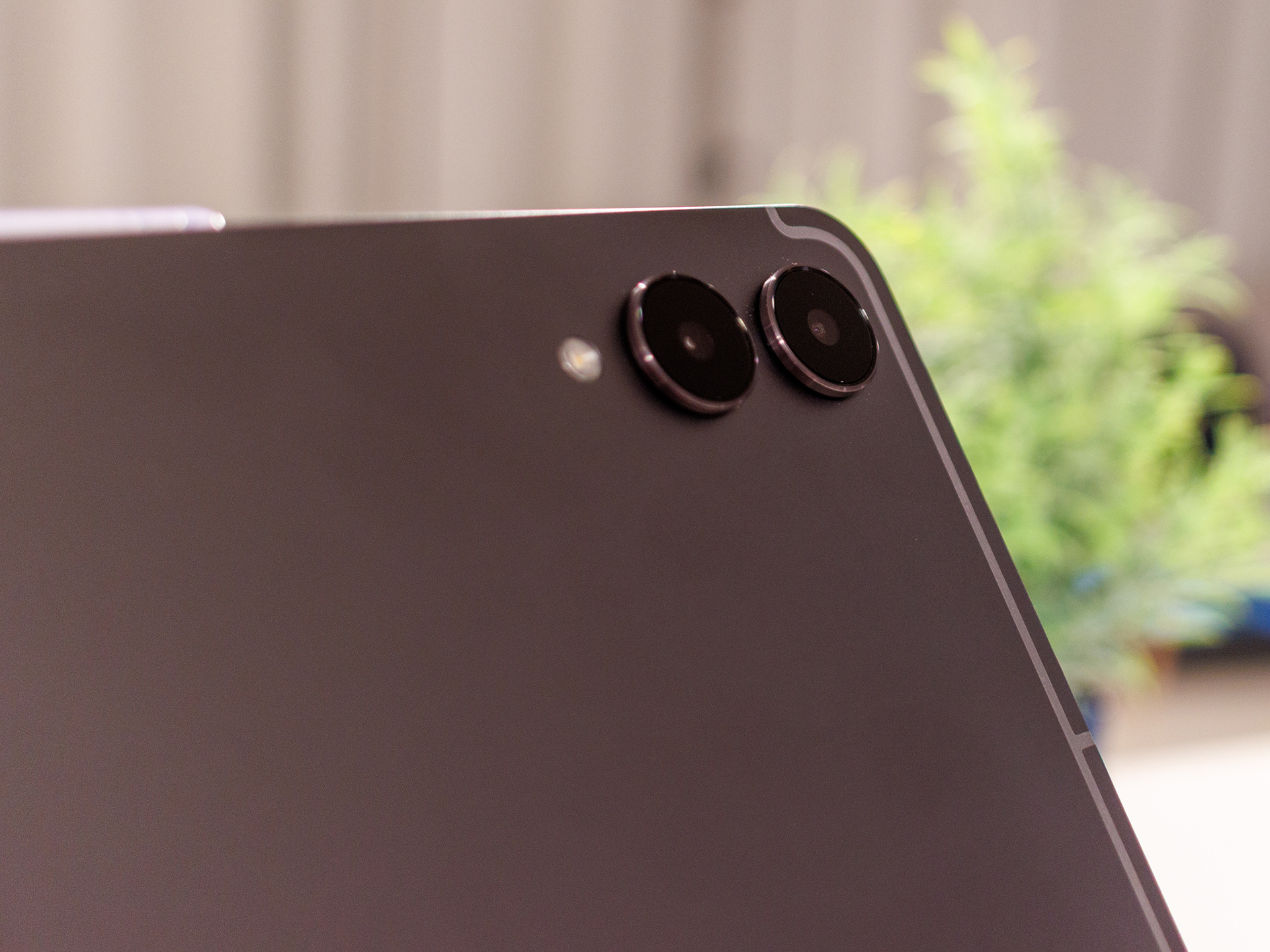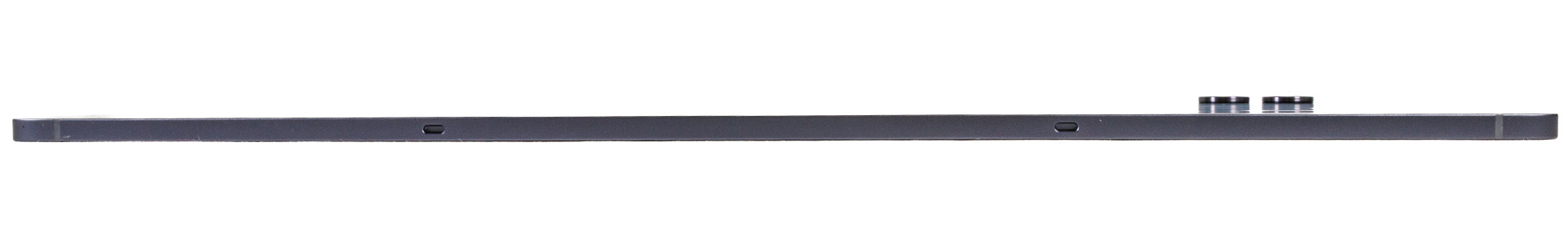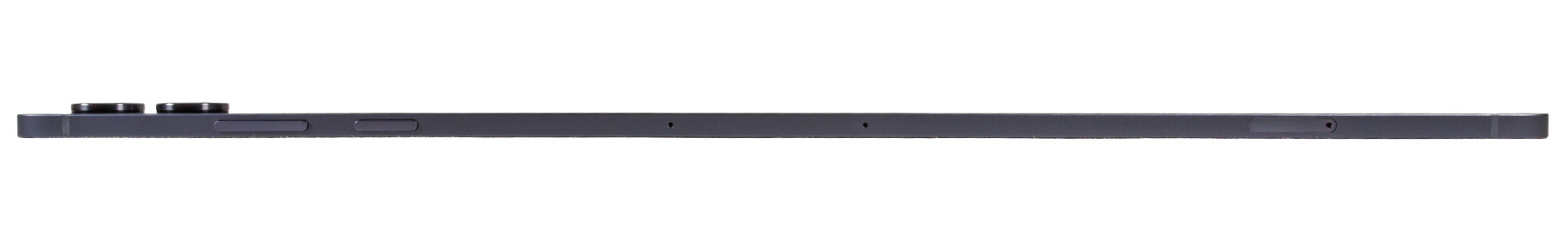 De voorganger's toch al slanke behuizing is nog dunner gemaakt in de Samsung Galaxy Tab S11 Ultra, nu met een specificatie van slechts 5,1 millimeter dikte, terwijl we in werkelijkheid een dikte van slechts 5,05 millimeter hebben gemeten. De twee camera's steken elk 2,15 millimeter uit, maar het apparaat wiebelt nauwelijks als het plat op tafel ligt.