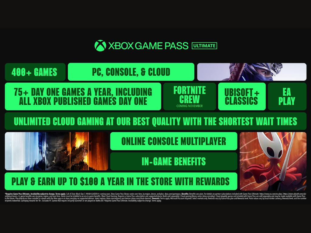 Deze add-on introduceert 14 Assassin's Creed-games, waaronder Assassin's Creed IV Black Flag, Assassin's Creed: The Ezio Collection, Assassin's Creed Unity, samen met andere Ubisoft-nietjes zoals Far Cry 3 en de Blood Dragon DLC, Prince of Persia: The Lost Crown, The Crew 2, Watch Dogs en Tom Clancy's Ghost Recon: Breakpoint, allemaal beschikbaar op cloud PC en Xbox, waardoor de bibliotheek van Game Pass Ultimate nu meer dan 400 games bevat. Bovendien zal Game Pass Ultimate jaarlijks meer dan 75 day-one releases bevatten en extraatjes zoals Fortnite Crew.