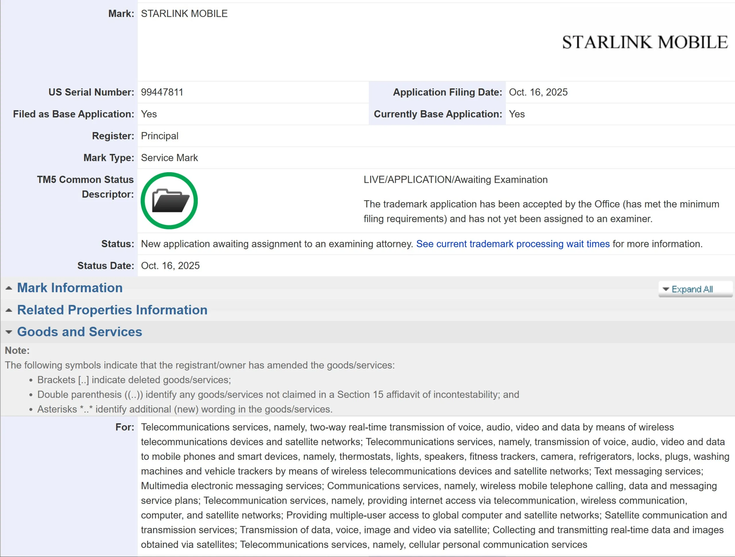 Om deze visie werkelijkheid te laten worden, heeft SpaceX nu de naam van de onderneming aangevraagd, Starlink Mobile als handelsmerk bij het USPTO, en de reikwijdte van de diensten van het nieuwe merk klinkt verdacht veel als de geboorte van een nieuwe mobiele telefoonprovider, die alleen spraak en gegevens vanuit de ruimte uitzendt, in plaats van vanaf aardse zendmasten: