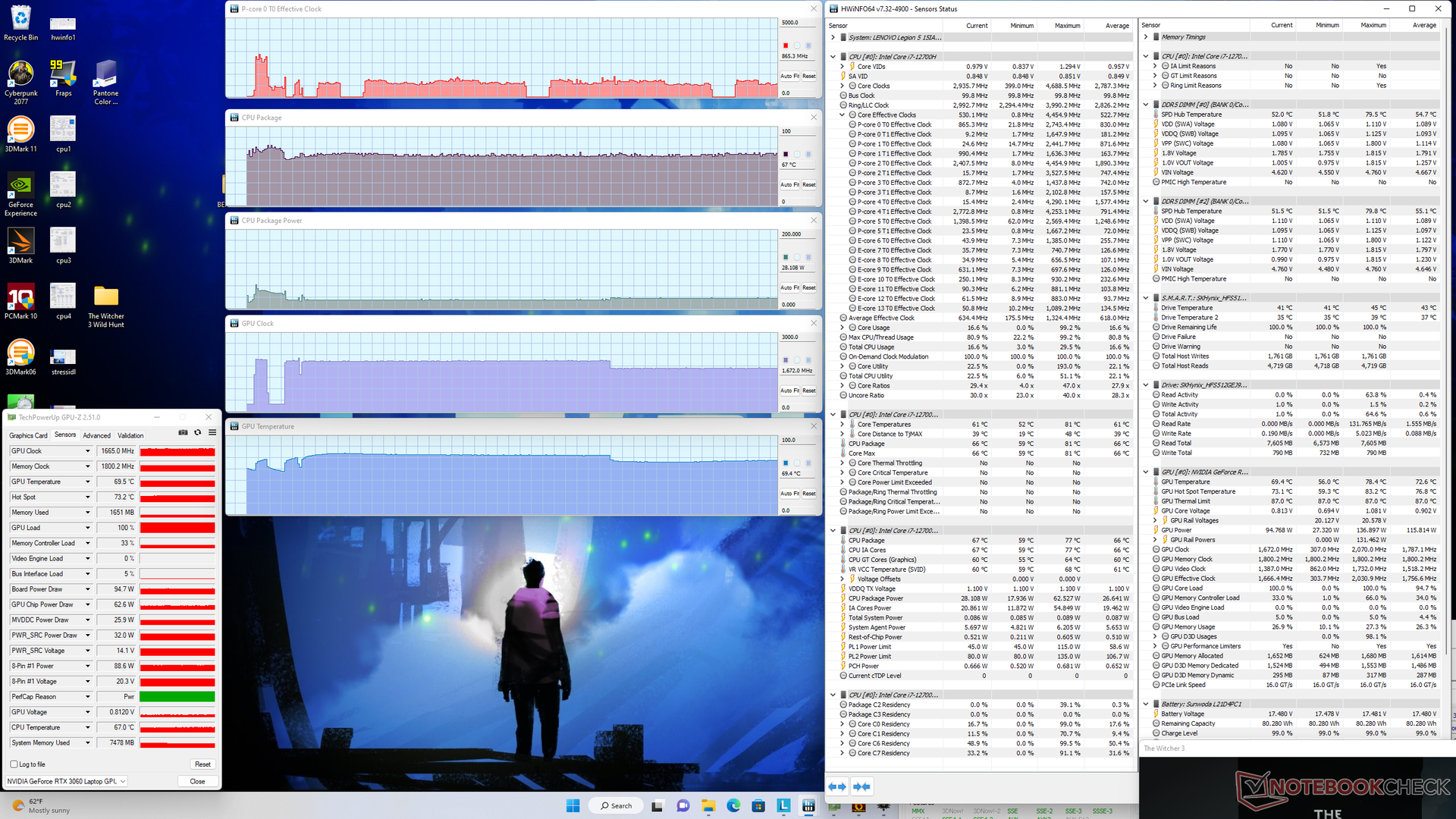 Het draaien van Witcher 3 de Nvidia GPU zou in de modus Prestaties, die de typische gamingbelasting weergeeft, stabiliseren op 1972 MHz, 134 W opgenomen vermogen en 76 C. In de modus Gebalanceerd zou de GPU stabiliseren op 1665 MHz, 95 W en 70 C, wat neerkomt op een prestatieverlies van 10 procent, zoals hierboven beschreven in het gedeelte over GPU-prestaties. Gebruikers moeten daarom de prestatiemodus inschakelen via de Vantage software als ze de GPU ten volle willen benutten.