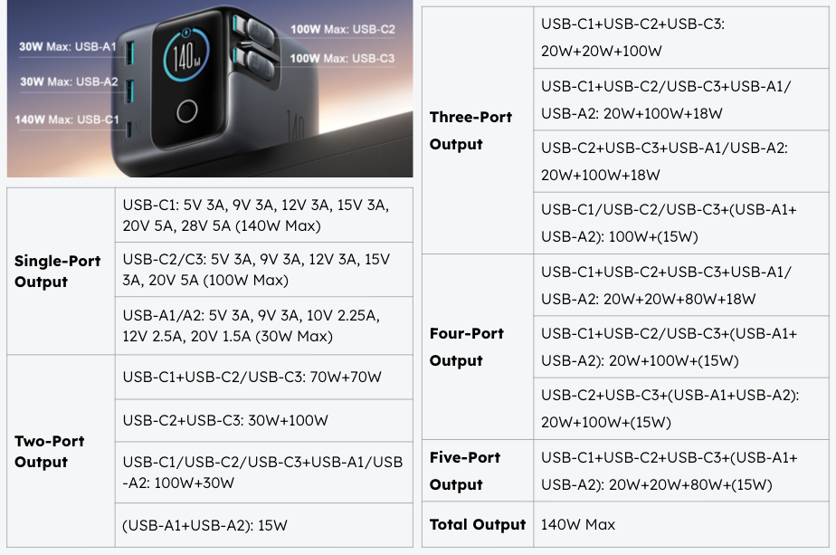 Dit is zeker een probleem dat in de praktijk kan voorkomen en waar u zich bewust van moet zijn, ook al heeft dit niet alleen betrekking op de betreffende lader. Het grote voordeel van de Joyroom Podix Charger ten opzichte van andere oplossingen: het ingebouwde display geeft altijd informatie over het beschikbare vermogen op de individuele poorten en stelt u in staat om snel te zien of de toewijzing veranderd moet worden ten gunste van een hoger vermogen. De volgende tabel (afgedrukt op de verpakking) toont de vermogensverdeling van de poorten met enkelvoudige en meervoudige toewijzingen:
