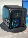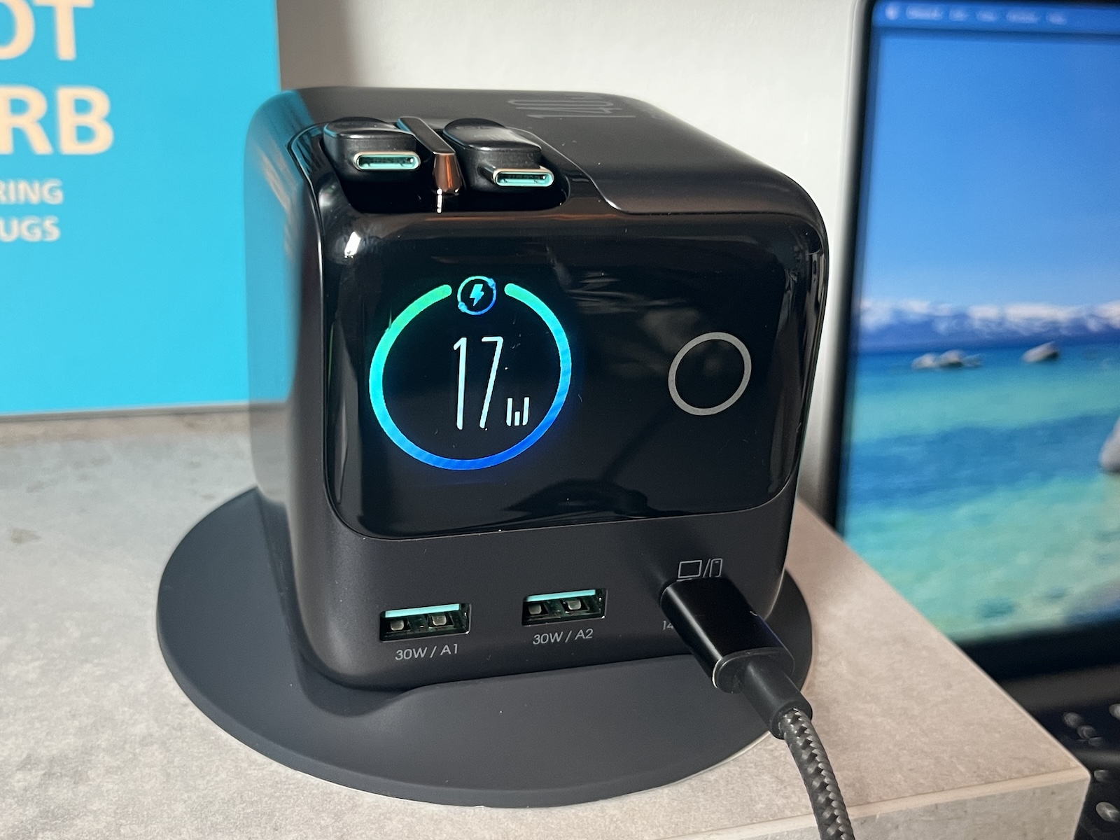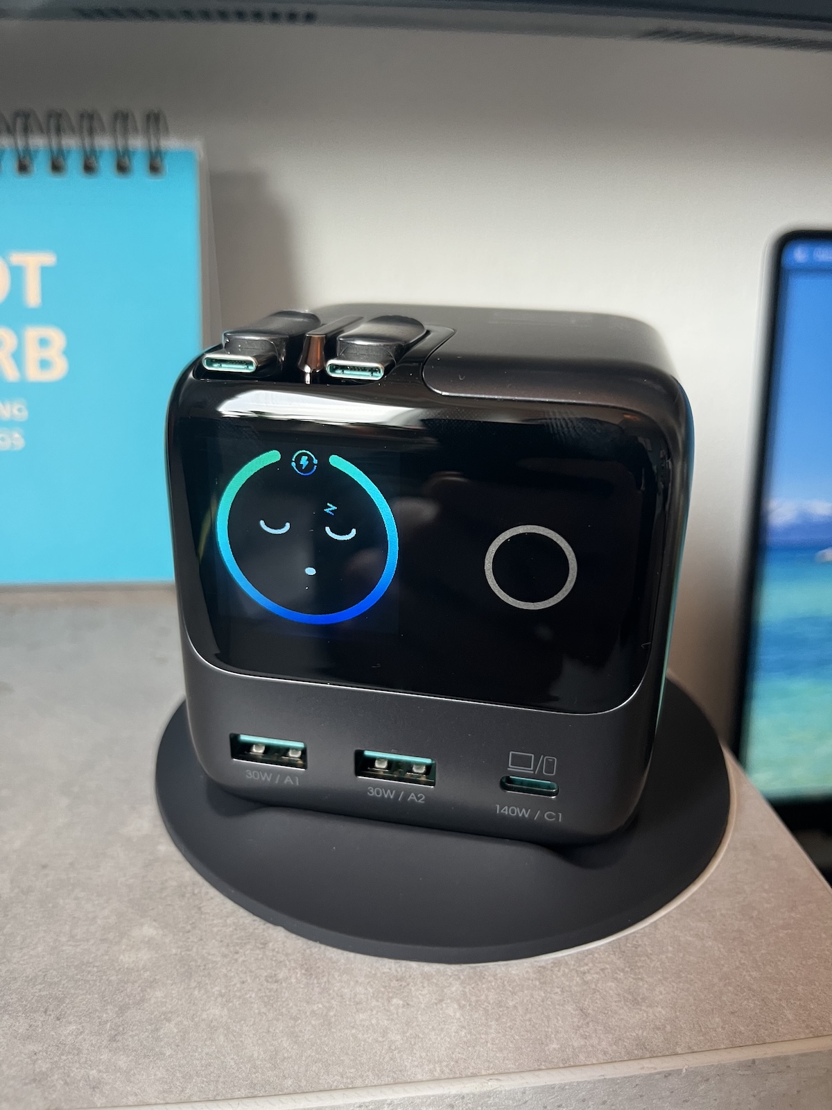 De Joyroom Podix 140W Charger kwam oorspronkelijk van een crowdfundingproject. Hij is niet ontworpen als mobiele voeding, maar eerder als universeel oplaadstation voor thuis en op kantoor. Onze weegschaal gaf 464 gram aan, duidelijk te veel om regelmatig mee te nemen. Het stationaire gebruik wordt onderstreept door de meegeleverde rubberen standaard, die aan de onderkant is voorzien van een zelfklevende (en afwasbare) siliconenlaag. De oplader zelf wordt magnetisch op zijn plaats gehouden. In principe kan de standaard weggelaten worden, maar dan moet hij met de andere hand op zijn plaats gehouden worden bij gebruik van de zelfborgende Type-C kabels. Hierover later meer. Het is ook mogelijk om de lader op een zijoppervlak te kantelen; met een driedubbele tik op het scherm past u de oriëntatie aan.
