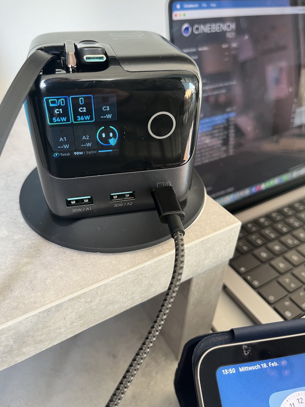 Theoretisch is het dus mogelijk dat slechts één bijzonder energieverslindend apparaat, zoals een laptop op poort C1, een groot deel van het beschikbare vermogen gebruikt en dat de andere poorten dienovereenkomstig beperkt worden. Het probleem doet zich echter eerder voor dat als apparaten tegelijkertijd op meerdere poorten zijn aangesloten, ze automatisch hun maximale vermogen verminderen, ongeacht het werkelijk verbruikte vermogen. Hier kan bijvoorbeeld slechts één aangesloten adapter in de test, een Type-C naar Lightning adapter, voldoende zijn om het vermogen op de andere poorten aanzienlijk te verminderen. In dit geval is het belangrijk om de apparaten die van stroom moeten worden voorzien op de optimale poort aan te sluiten. Het apparaat met het hoogste stroomverbruik moet worden aangesloten op poort C3 (de rechterpoort van de twee verlengbare kabels), omdat deze poort het hoogst mogelijke vermogen levert met meerdere aansluitingen. Als er slechts één apparaat wordt aangesloten, zou dit de Type-C aansluiting C1 zijn.