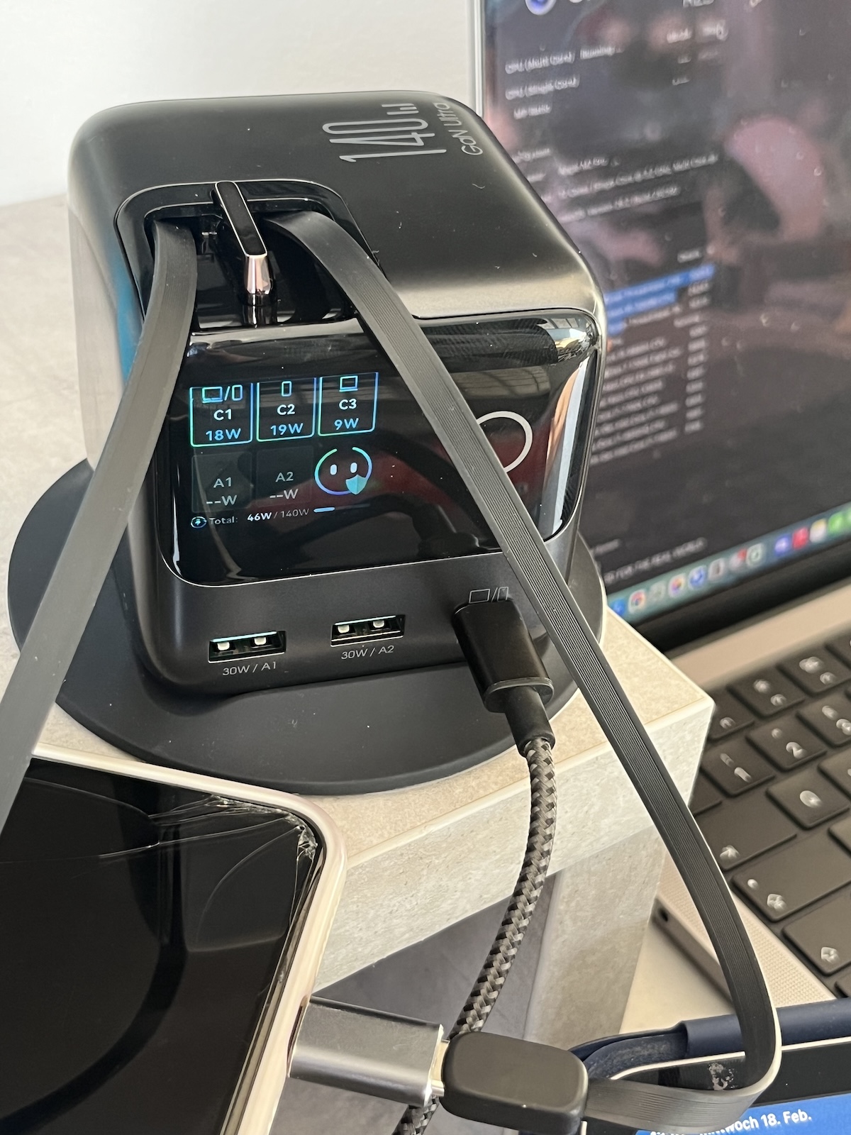 De Joyroom Podix 140W Charger biedt veel poorten en kan daarom verschillende aparte opladers en kabels vervangen. De output van maximaal 140 watt is ruim voldoende om zelfs laptops (op kantoor) van voldoende stroom te voorzien en tegelijkertijd verschillende kleine gadgets op te laden. Wees voorzichtig bij het toewijzen van de poorten, want het uitgangsvermogen van individuele poorten wordt sterk beperkt als er meerdere poorten worden gebruikt. Het hoogtepunt zijn de twee Type-C kabels, die opgerold in het apparaat zitten en indien nodig tot ongeveer 75 centimeter verlengd kunnen worden. Dit betekent dat rondslingerende oplaadkabels voor mobiele telefoons eindelijk tot het verleden behoren.