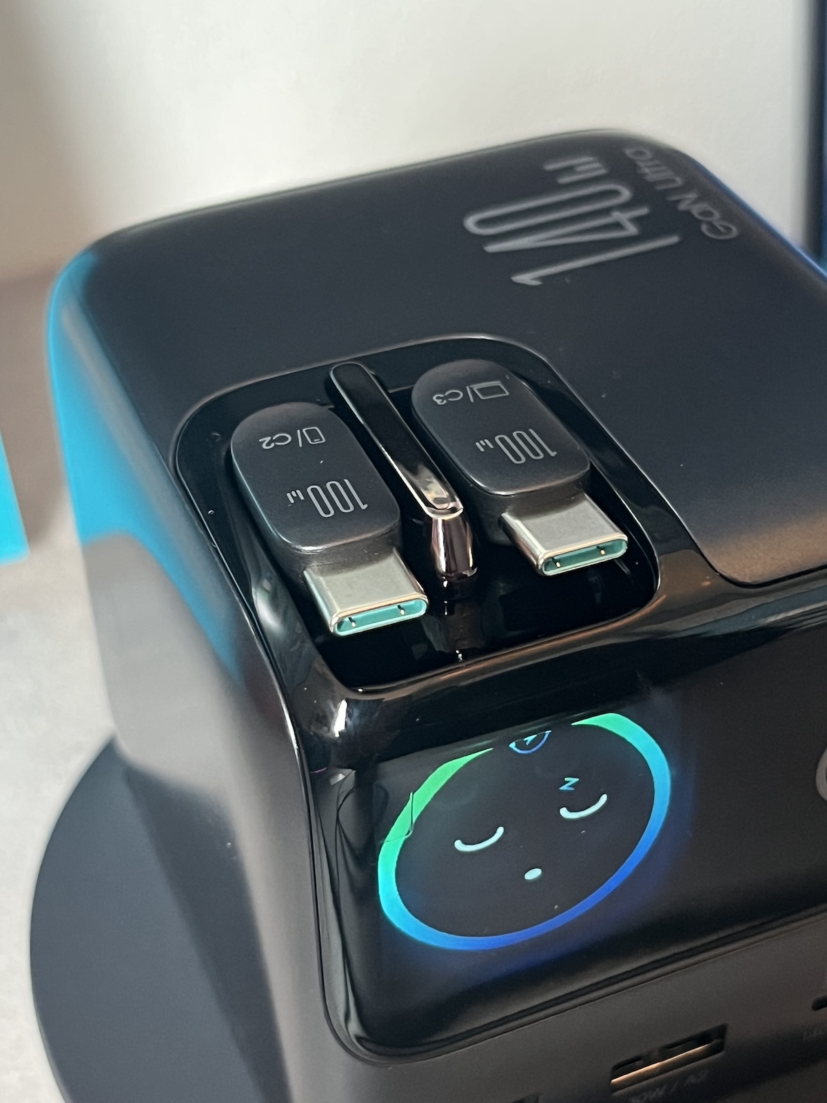 De lader biedt in totaal 5 aansluitmogelijkheden: een USB Type-C aansluiting met een maximaal vermogen van 140 watt - ideaal voor het aansluiten van bijvoorbeeld een laptop, twee USB Type-A aansluitingen met elk een maximaal vermogen van 30 watt en twee USB Type-C aansluitingen, die indien nodig ongeveer 75 cm verlengd kunnen worden en dus perfect zijn voor het opladen van smartphones of mobiele apparaten. Het maximale vermogen op elk van deze aansluitingen is 100 watt. Beide kabels zijn uitgerust met een vergrendelfunctie, wat betekent dat ze in positie blijven nadat de kabel is uitgetrokken. Nadat u ze weer even hebt vastgedraaid, worden ze weer terug in de behuizing geschoven.