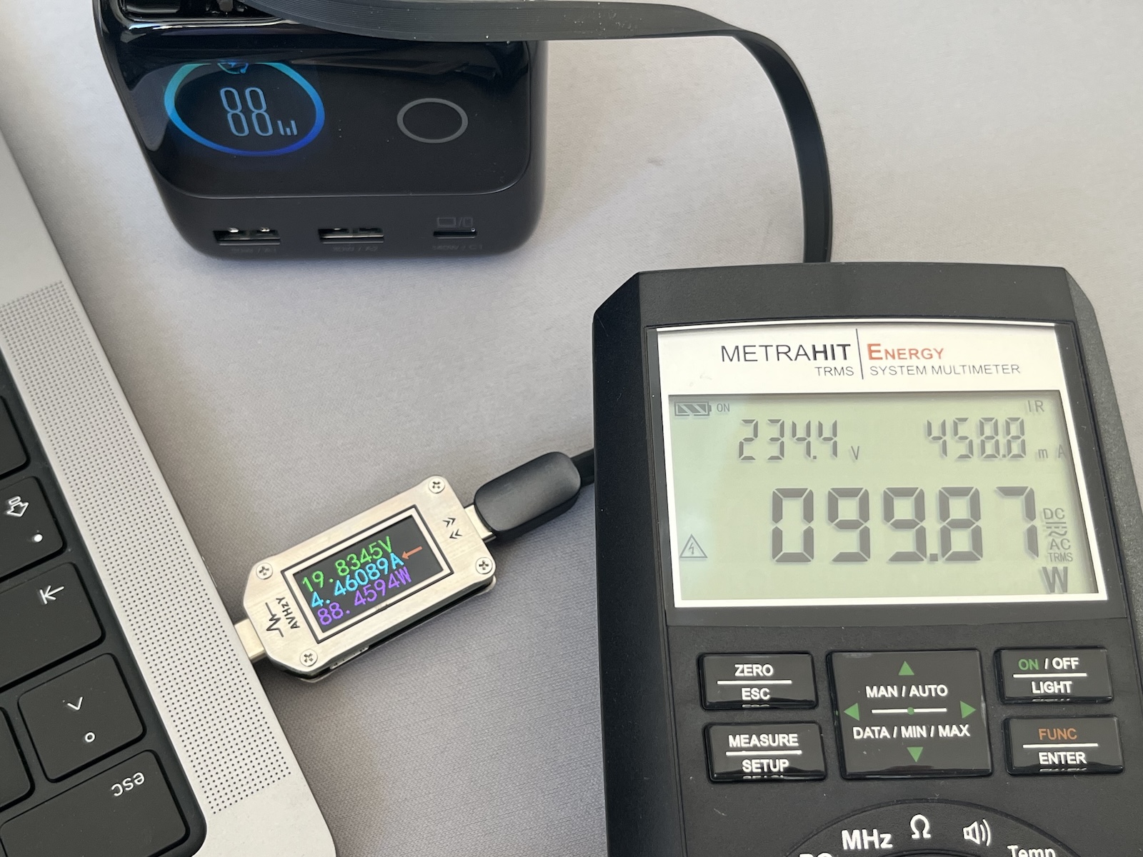 We hebben ook de efficiëntie en nauwkeurigheid van de opgegeven vermogenswaarden onder de loep genomen. Hiervoor gebruikten we een hoogwaardige Gossen Metrawatt multimeter en een USB-vermogensmeter van AVHzY. Volgens onze vergelijkingen komen de vermogenswaarden van de aangesloten verbruikers die op het display worden weergegeven overeen binnen een bereik van 0-5% afwijking.