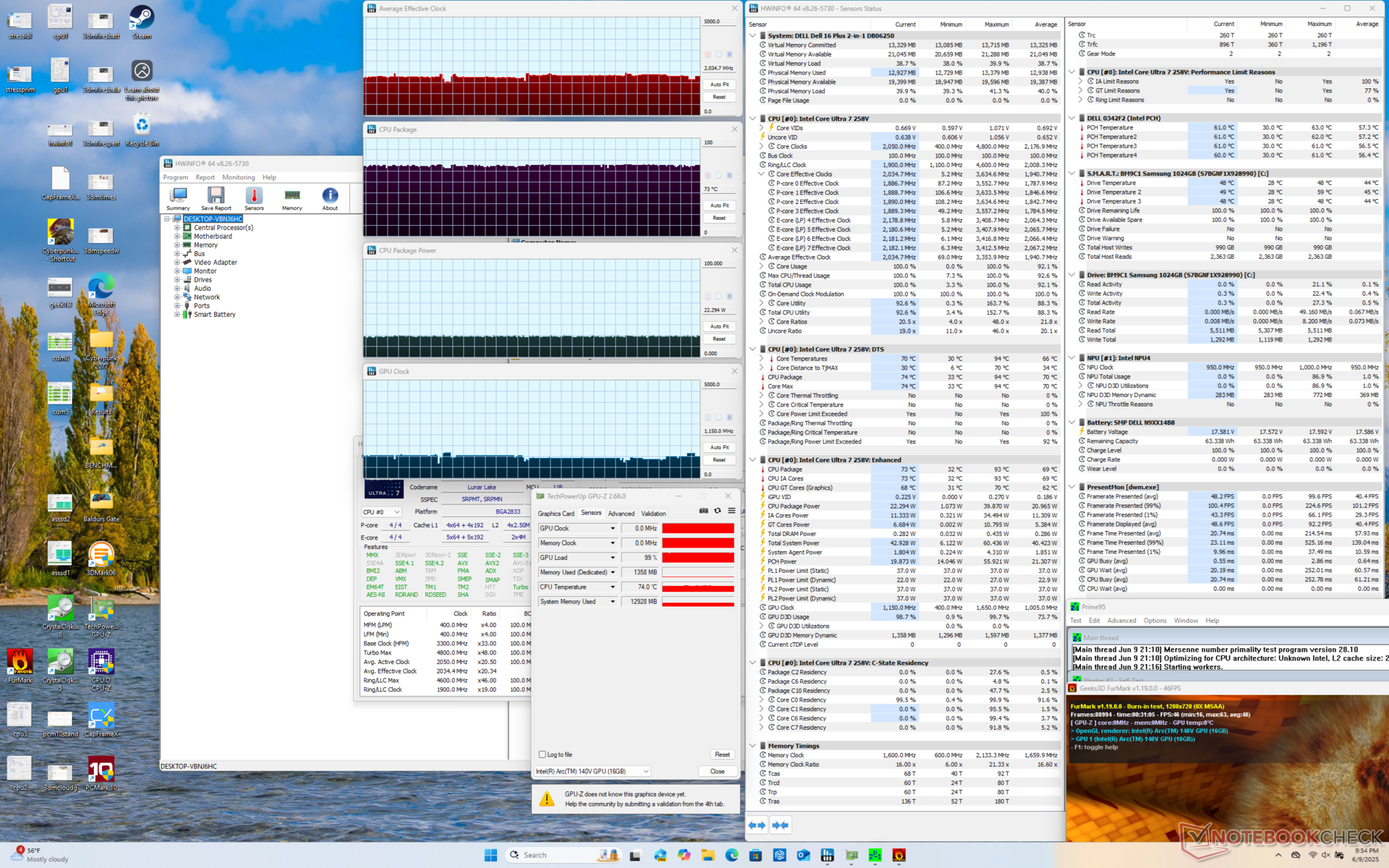 Bij het starten van Prime95 stress, verhoogde de CPU naar 3,4 GHz en 38 W totdat hij enkele seconden later 93 C bereikte. Daarna daalden de prestaties naar 2,5 GHz en 22 W om een koelere kerntemperatuur van 72 C te handhaven. Dit is bijna 15 C koeler in vergelijking met de Inspiron 16 7640 2-in-1 onder vergelijkbare omstandigheden, maar vergeet niet dat de Dell 16 Plus 2-in-1 ook met een langzamere processor wordt geleverd.