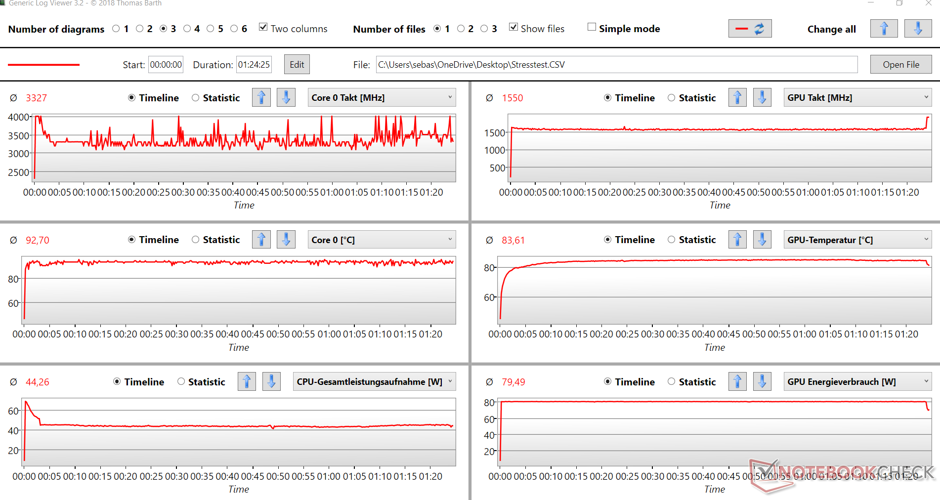 In de stresstest (Prime95 en FurMark worden minstens een uur lang uitgevoerd), komt de CPU uit op ongeveer 3,3 GHz en een temperatuur van ongeveer 93 °C (~199 °F) na een korte initiële piek op de limiet. Bij een gemiddelde van 1.550 MHz werkt de grafische kaart relatief net onder zijn maximum bij een constant niveau en een temperatuur van iets onder 85 °C (~185 °F). Het systeem blijft stabiel, zelfs onder volledige belasting.