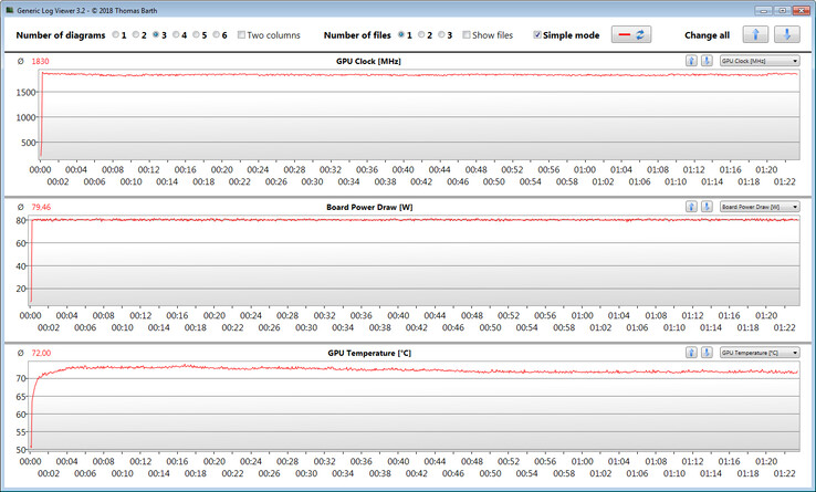 Tijdens de stresstest waarbij Prime95 en Furmark minstens een uur draaien, draaien de CPU en GPU op respectievelijk 3,2 GHz en 1500 tot 1600 MHz. De stresstest vertegenwoordigt een extreem scenario dat we gebruiken om te evalueren of het systeem ook stabiel blijft bij volledige belasting.