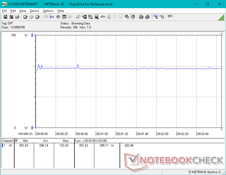 We zijn in staat om een maximale trek van 137 W te registreren van de middelgrote (~15,3 x 7,5 x 2,6 cm) 130 W AC adapter bij het gelijktijdig draaien van zowel Prime95 als FurMark. Het verbruik heeft de neiging om te wisselen tussen 110 W en 137 W, zoals blijkt uit onze schermafdruk hieronder. Reken op een tragere oplaadsnelheid als u dergelijke zware belastingen gebruikt.