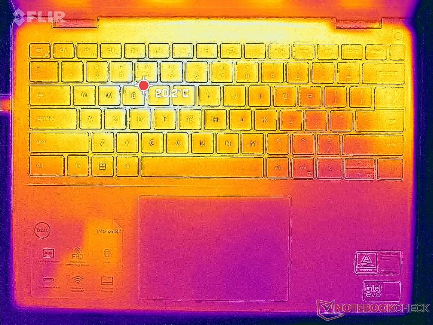 De oppervlaktetemperaturen zijn warmer op de linkerhelft van de laptop dan op de rechterhelft, wat in tegenstelling is tot de meer symmetrische temperatuurkaart van het oudere Inspiron 14 Plus 7420-ontwerp. De WASD-toetsen kunnen tijdens het gamen 40 C bereiken en zijn daarmee warmer dan dezelfde toetsen op concurrerende systemen zoals de Asus Vivobook Pro 14. Hete plekken zijn niet warm genoeg om oncomfortabel aan te voelen, maar het temperatuurverschil tussen de twee helften van de laptop is merkbaar.